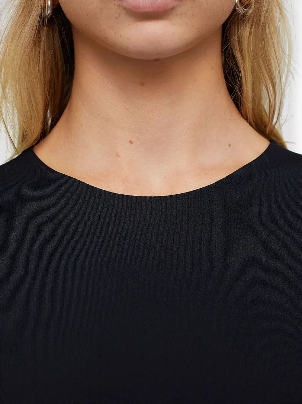 Темно-синий, круглый вырез, короткие рукава, подол в рубчик и эластичный материал.