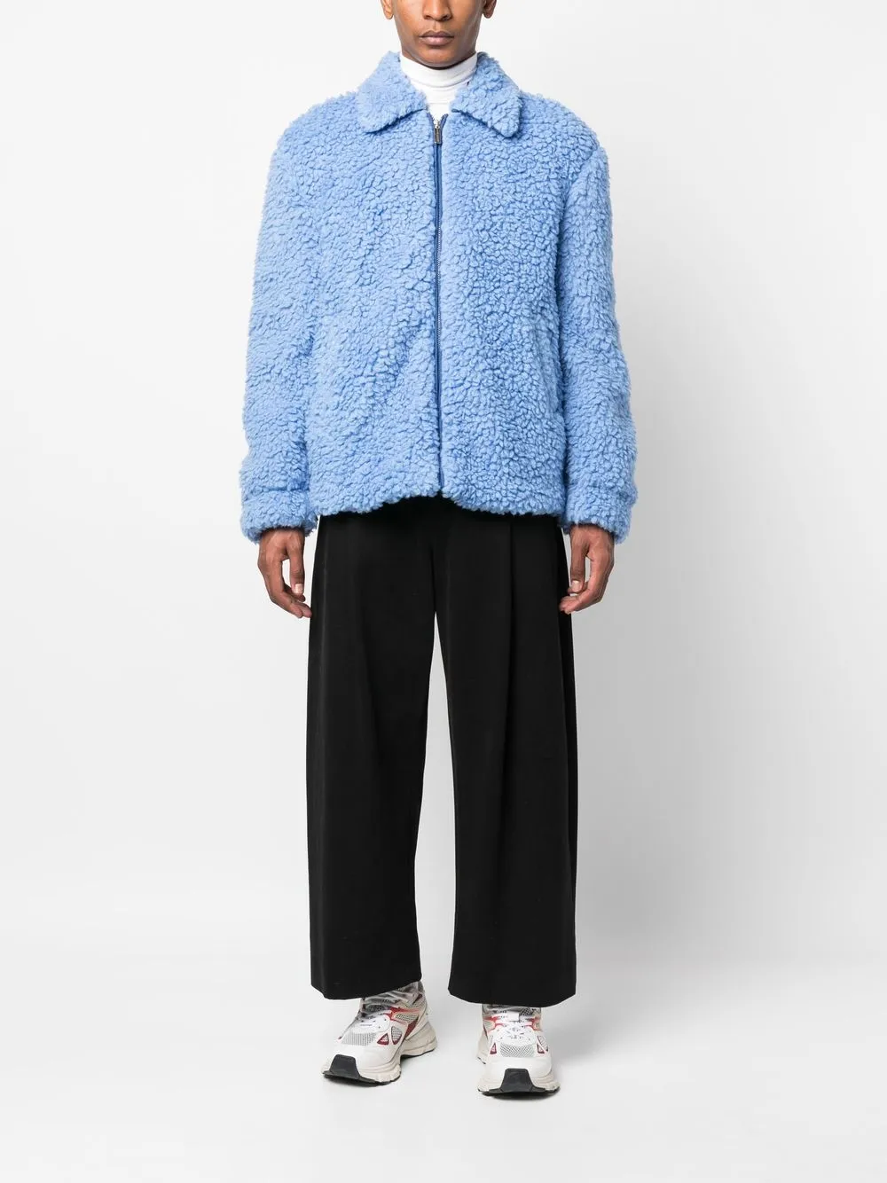 Голубой, дутый материал, отделка из шерпы, плоский заостренный воротник, застежка на молнии спереди, длинные рукава, прямой подол и цельная подкладка.