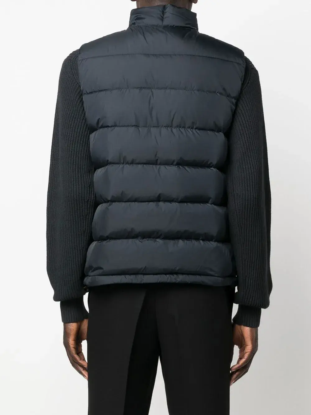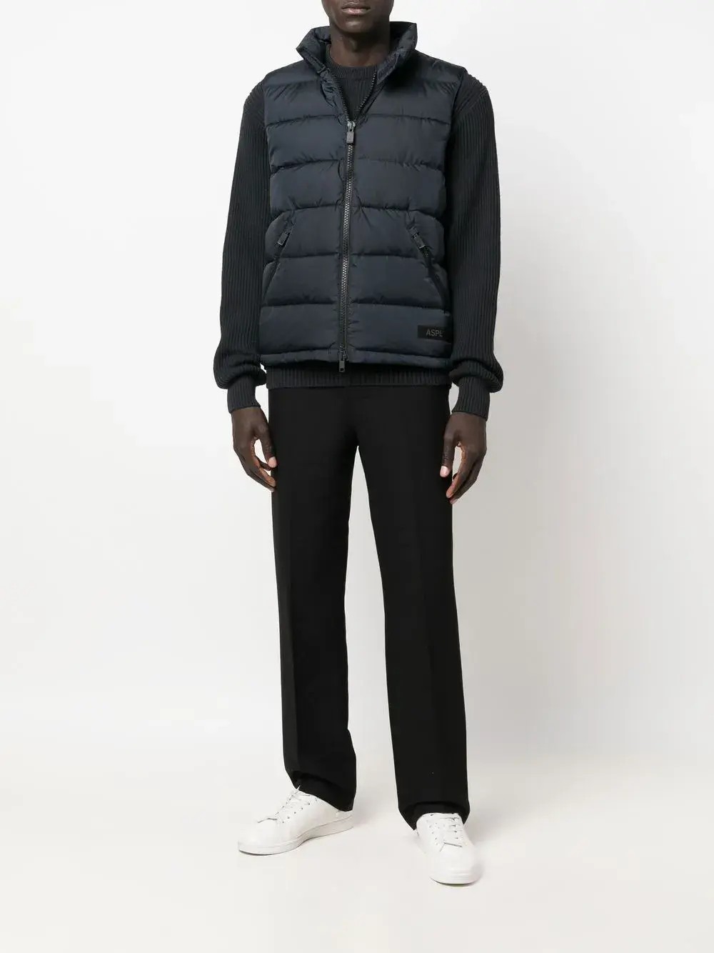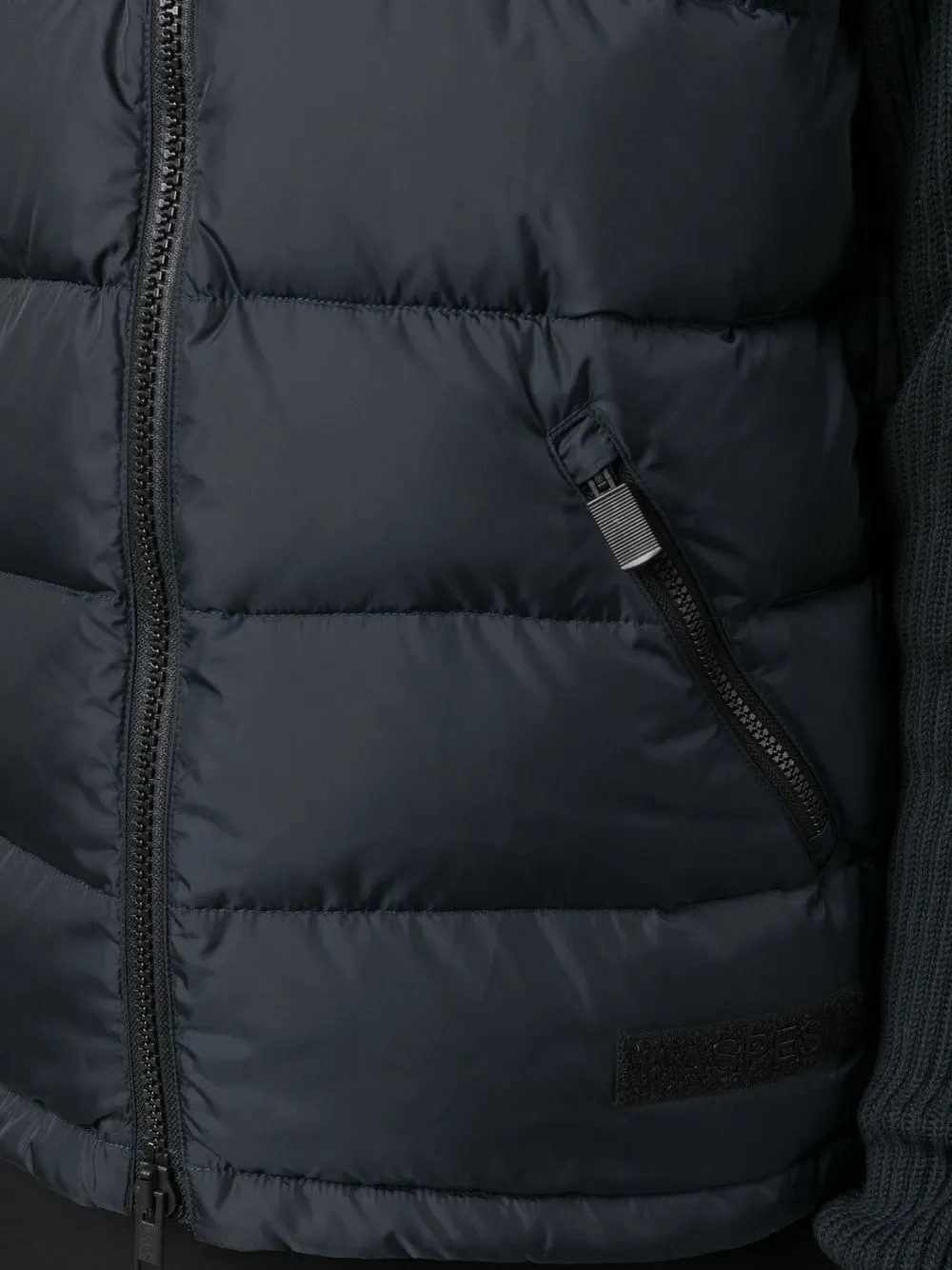 Темно-синий, дутый материал, нашивка с логотипом спереди, наполнитель из смеси пуха и пера, двусторонняя молния спереди, воротник-стойка, без рукавов, два кармана на молнии по бокам, подол с кулиской и прямой подол.
