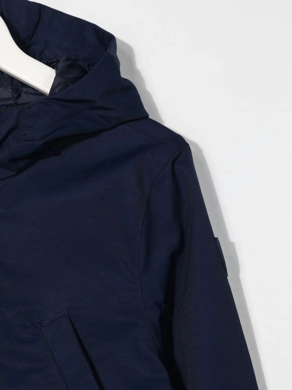 Темно-синий, переработанный нейлон, смесовый хлопок, классический капюшон, застежка на молнии спереди, передние карманы с клапаном, длинные рукава и закругленный подол.