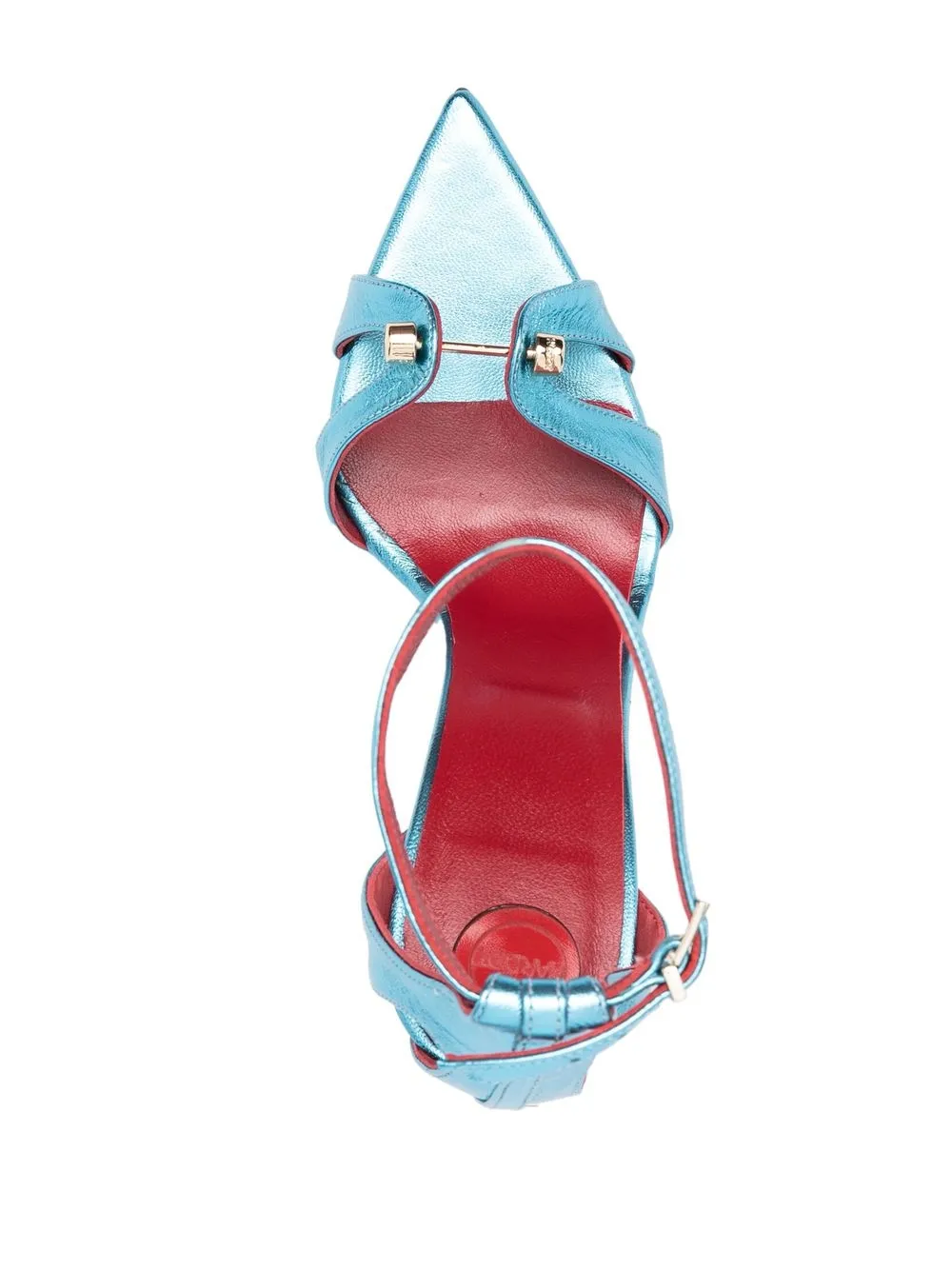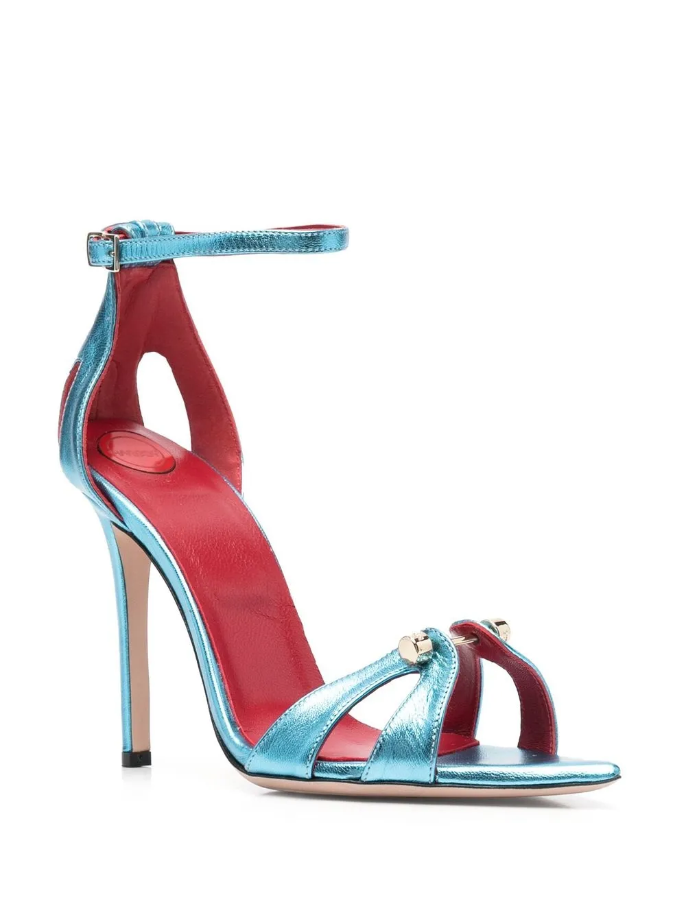 Телячья кожа, покрытие с эффектом металлик, вырезные детали, открытый носок, кожаная стелька с логотипом и каблук на высокой шпильке.