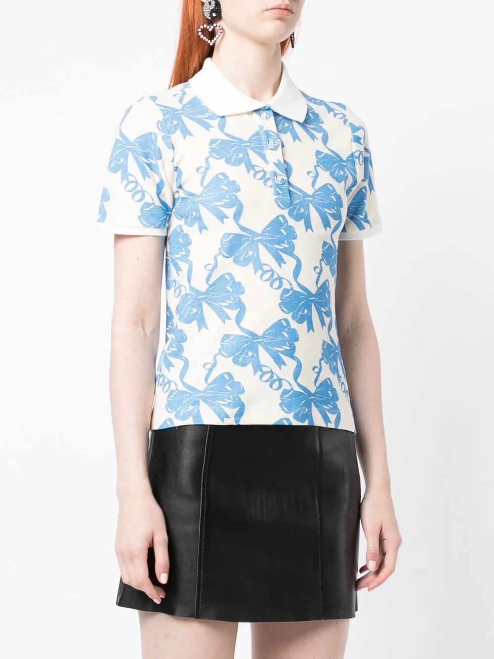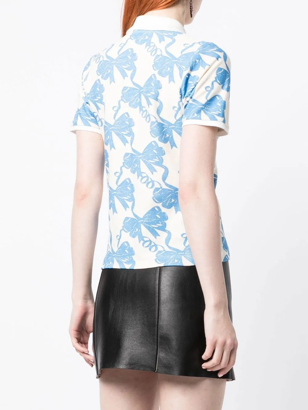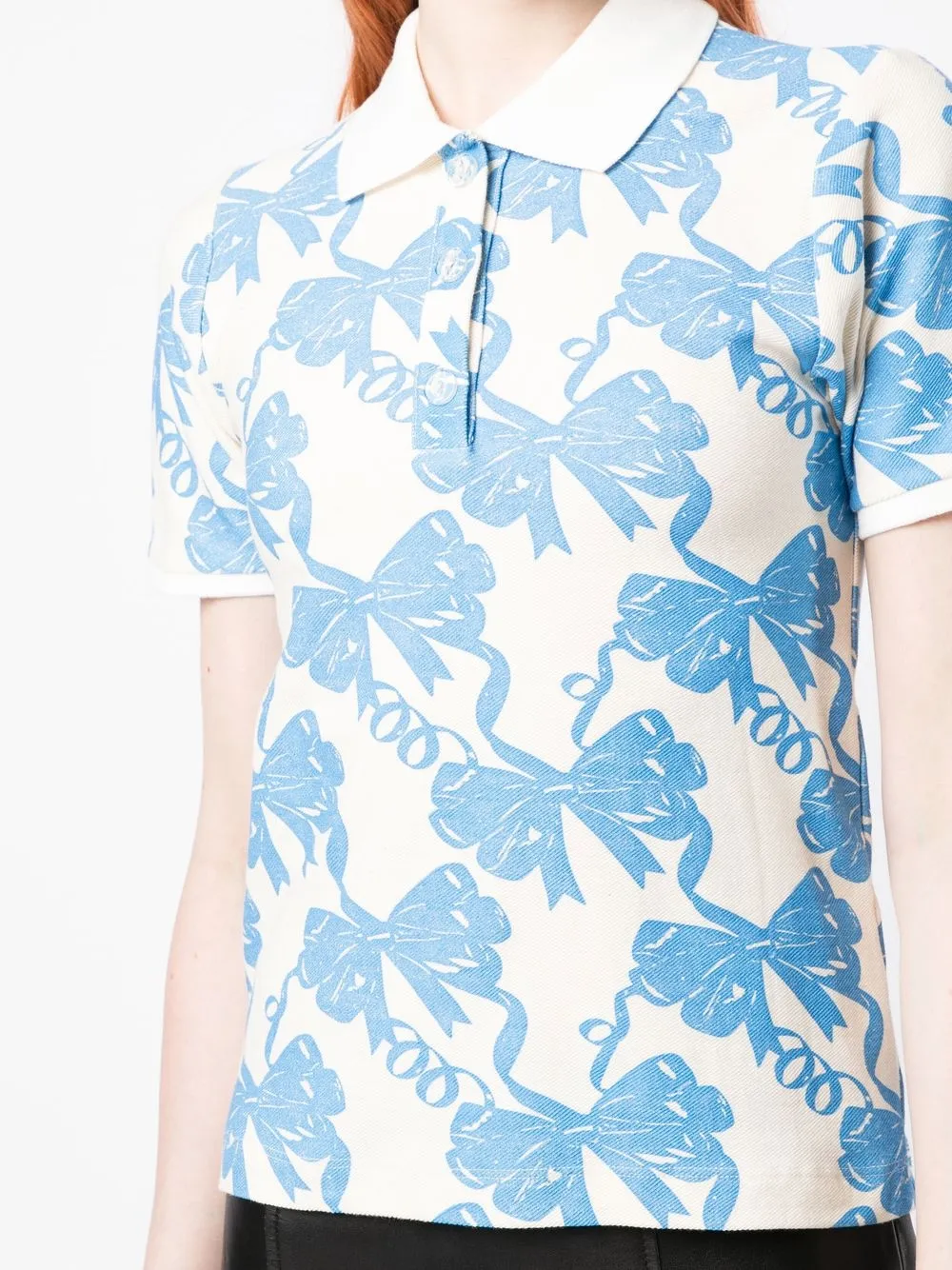 Кремово-белый, голубой, хлопок, принт с изображением бантов, воротник поло, планка на пуговицах спереди, короткие рукава и прямой подол.