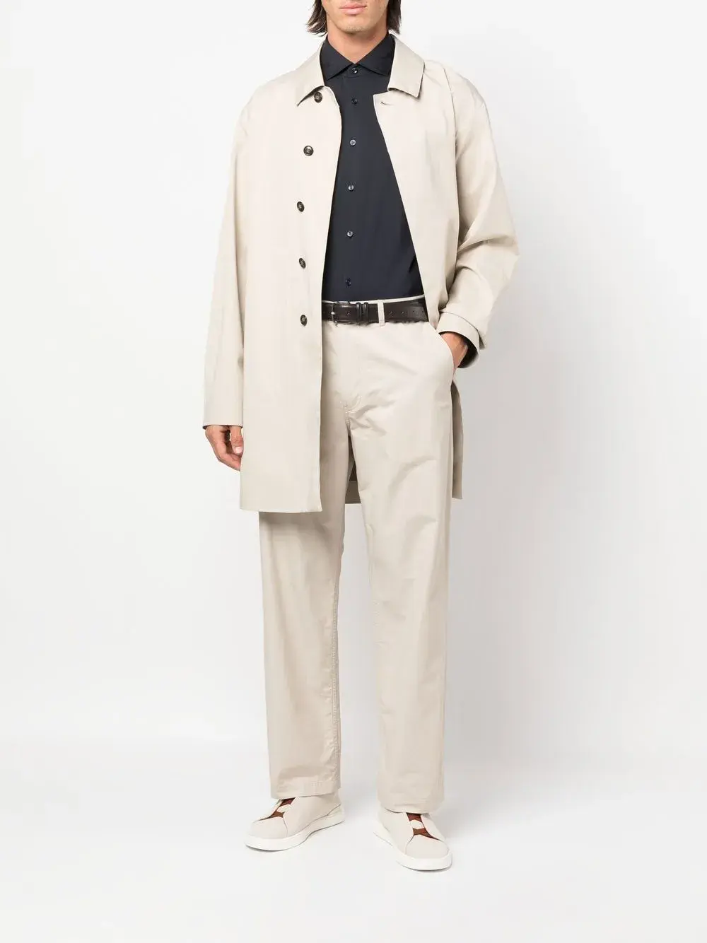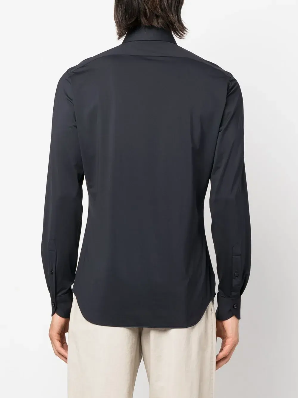 Темно-синий, классический воротник, застежка на пуговицах спереди, длинные рукава, манжеты на пуговицах и закругленный подол.