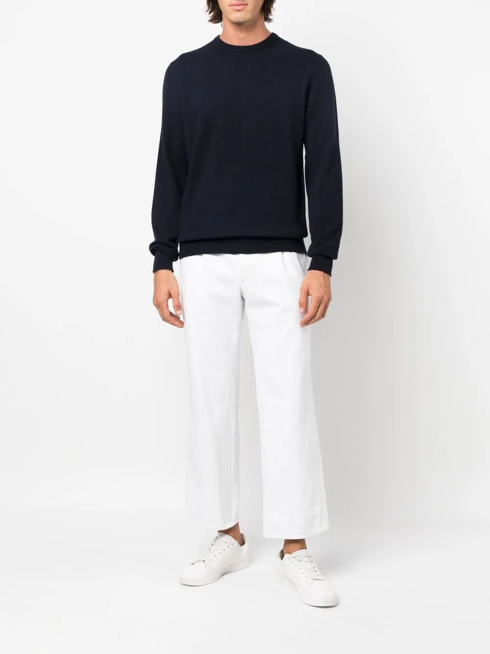 Темно-синий, кашемир, тонкая вязка, круглый вырез, длинные рукава и прямой подол.