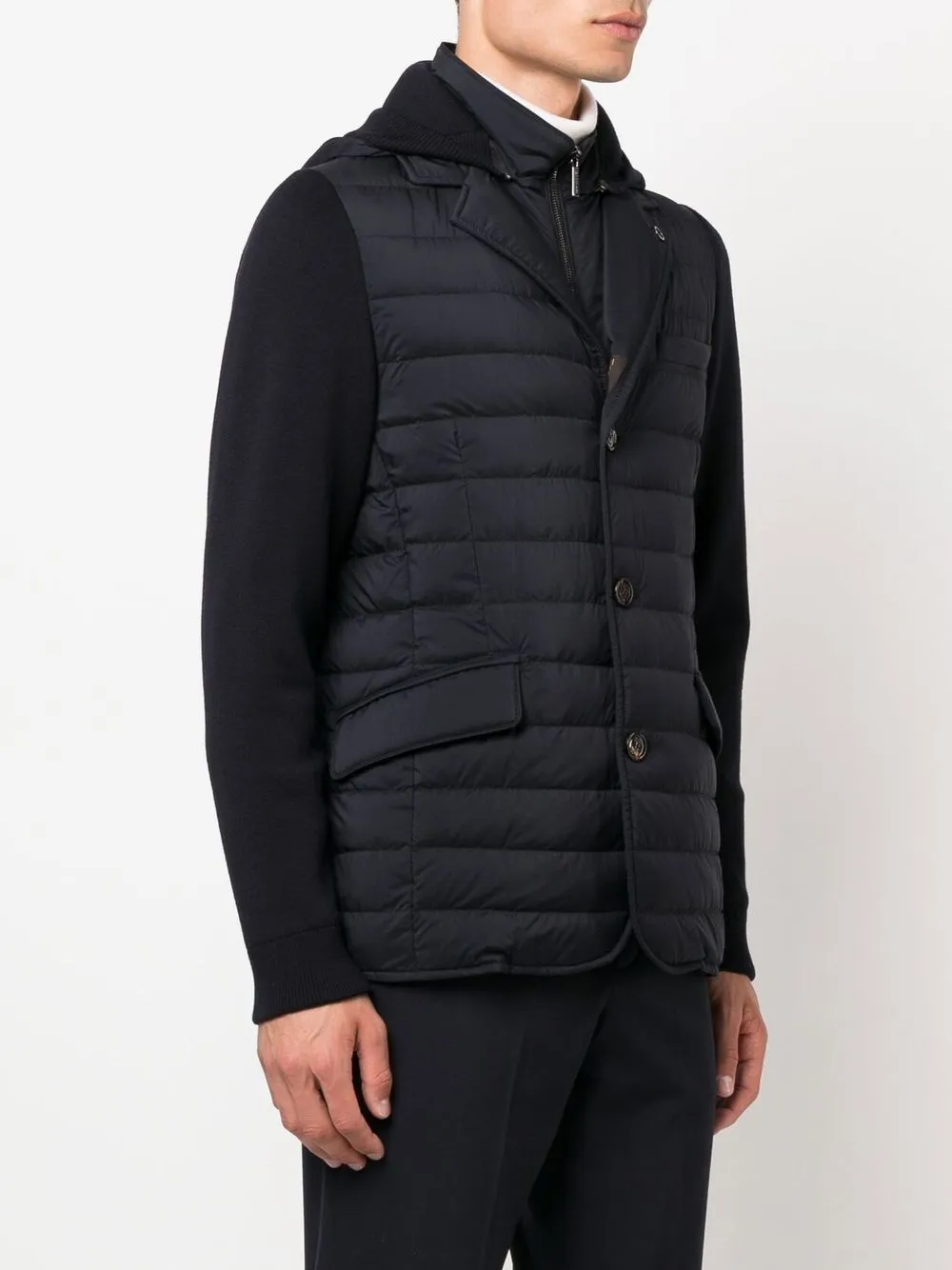 Синий, смесь шерсти и шелка, наполнитель из смеси пуха и пера, многослойный дизайн, стеганая модель, вставки, контрастные рукава, дутый материал, классический капюшон, застежка на молнии спереди, застежка на пуговицы, прорезной карман на груди, два передних кармана с клапанами, длинные рукава и прямой подол.