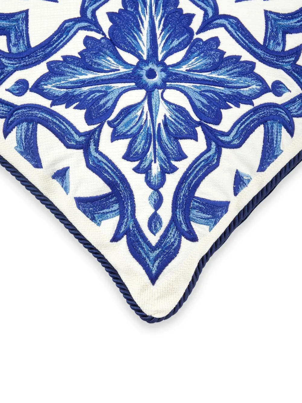 Синий/белый, хлопок, бархатный эффект, вышивка, принт Majolica, отделка кружевом торшон, застежка на молнии и квадратная форма.