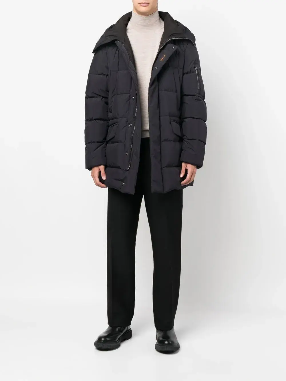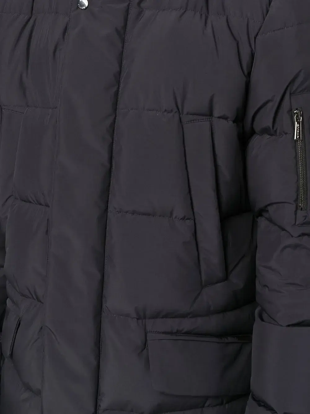 Темно-синий, наполнитель из смеси пуха и пера, дутый материал, нашивка с логотипом спереди, классический капюшон, потайная молния спереди, застежка на кнопках спереди, длинные рукава, прорезные карманы по бокам и два передних кармана с клапанами.