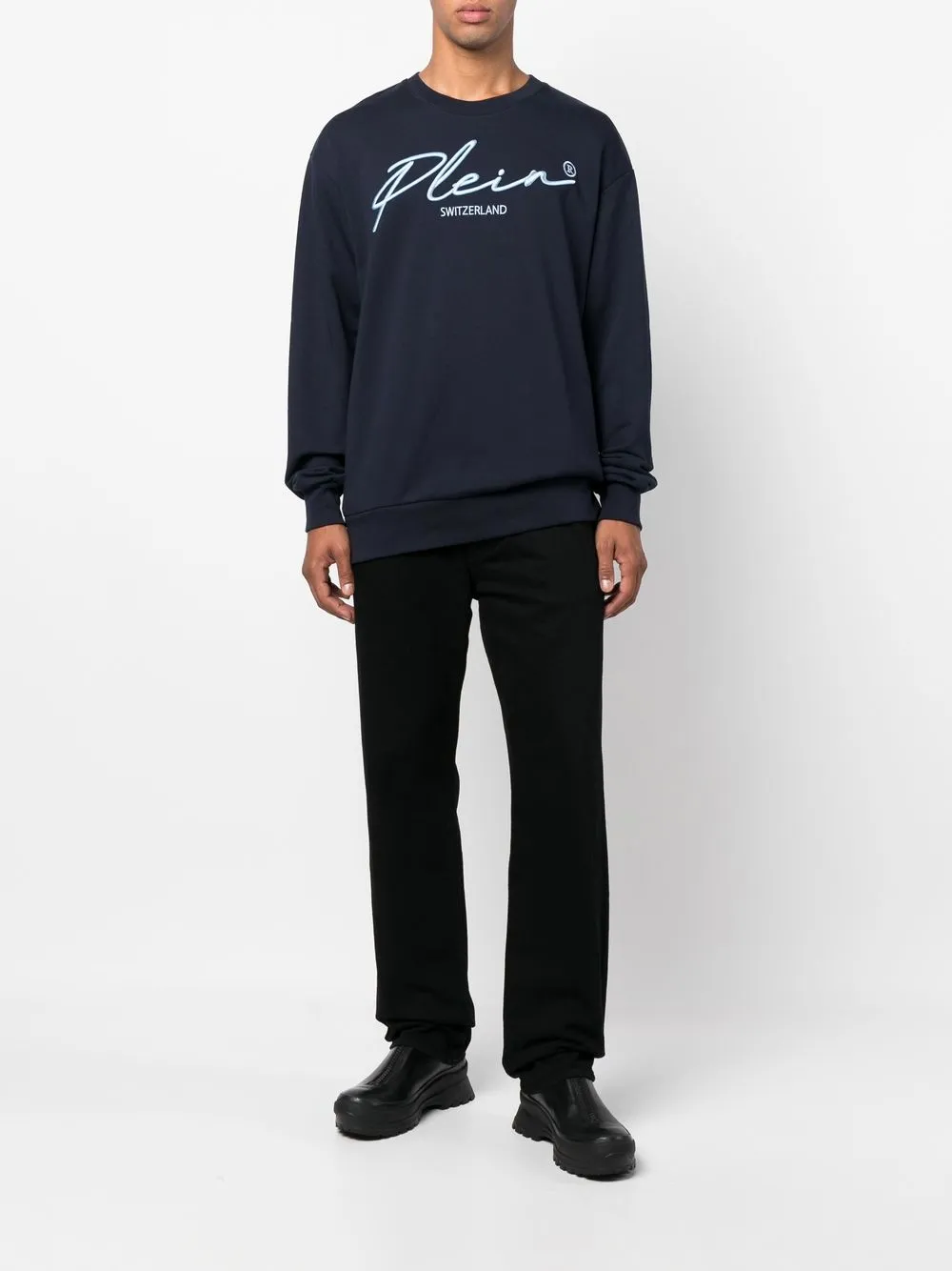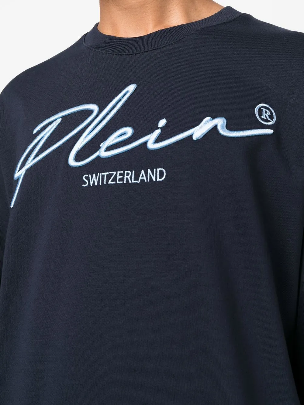 Темно-синий, хлопок, принт с логотипом на груди, круглый вырез и длинные рукава.