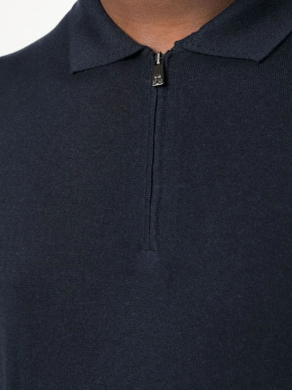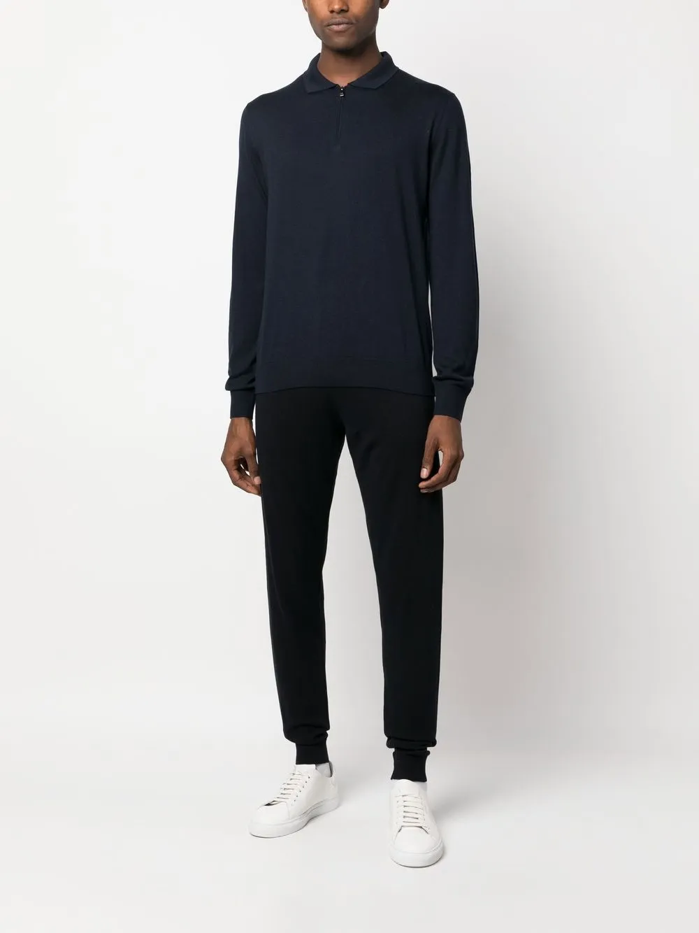 Темно-синий, смесь хлопка и кашемира, воротник поло и длинные рукава.