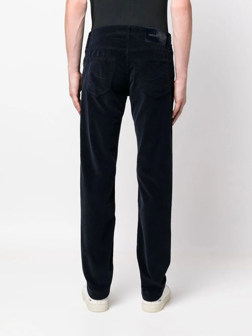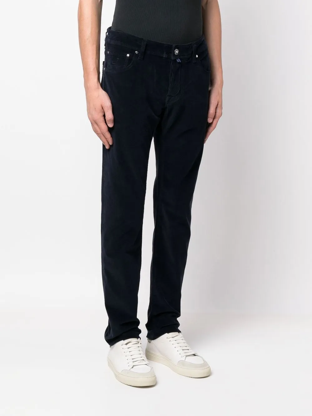 Темно-синий, смесовый хлопок, темный оттенок денима, средняя посадка, облегающий крой, пять карманов, застежка на молнии и пуговице спереди и петли для ремня.
