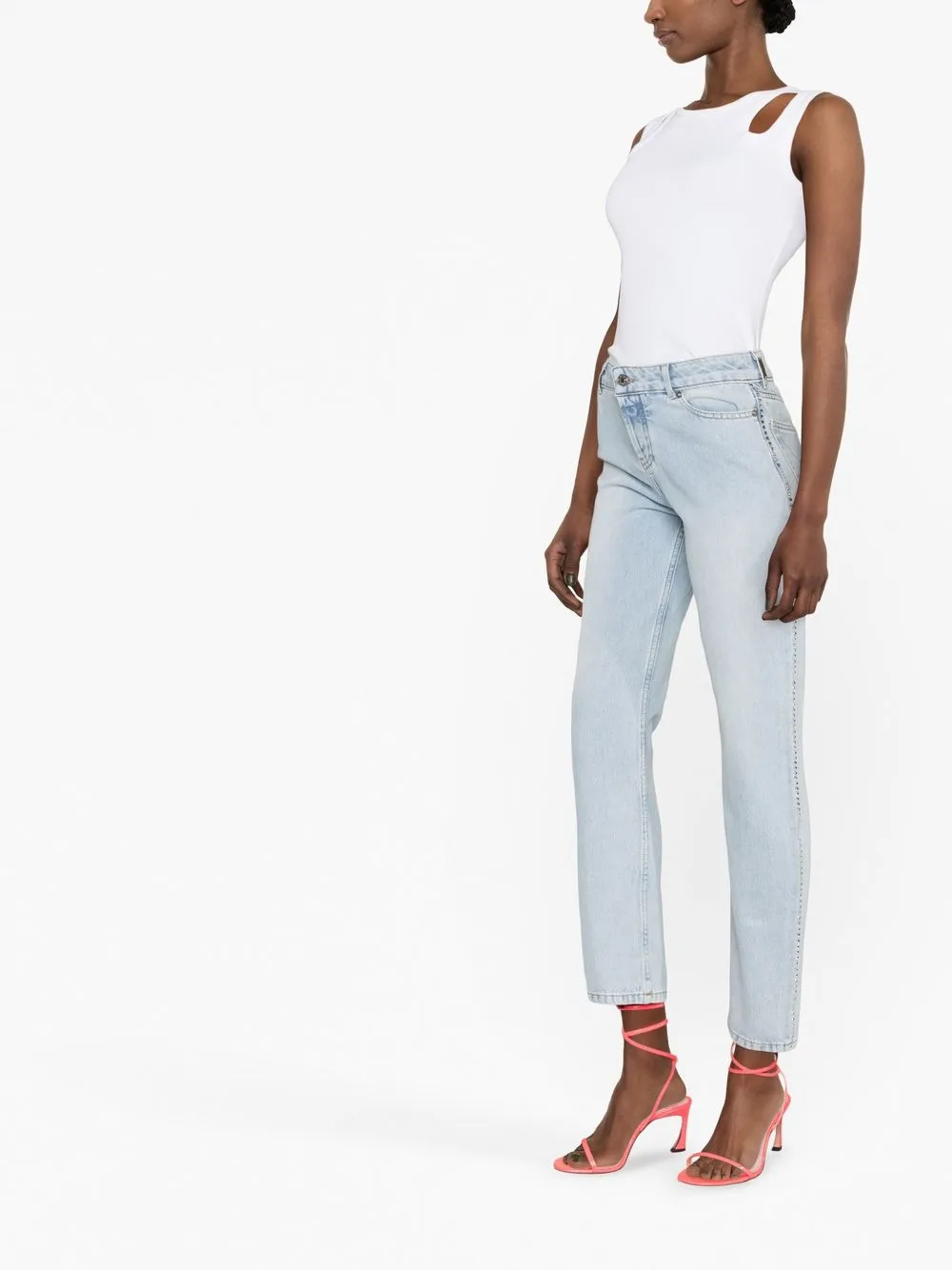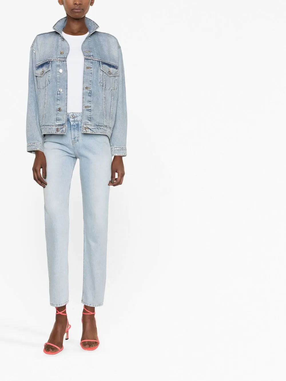 Голубой, хлопок, украшения из горного хрусталя, средняя посадка, петли для ремня, потайная застежка спереди, пять карманов, узкий крой и прямой крой.