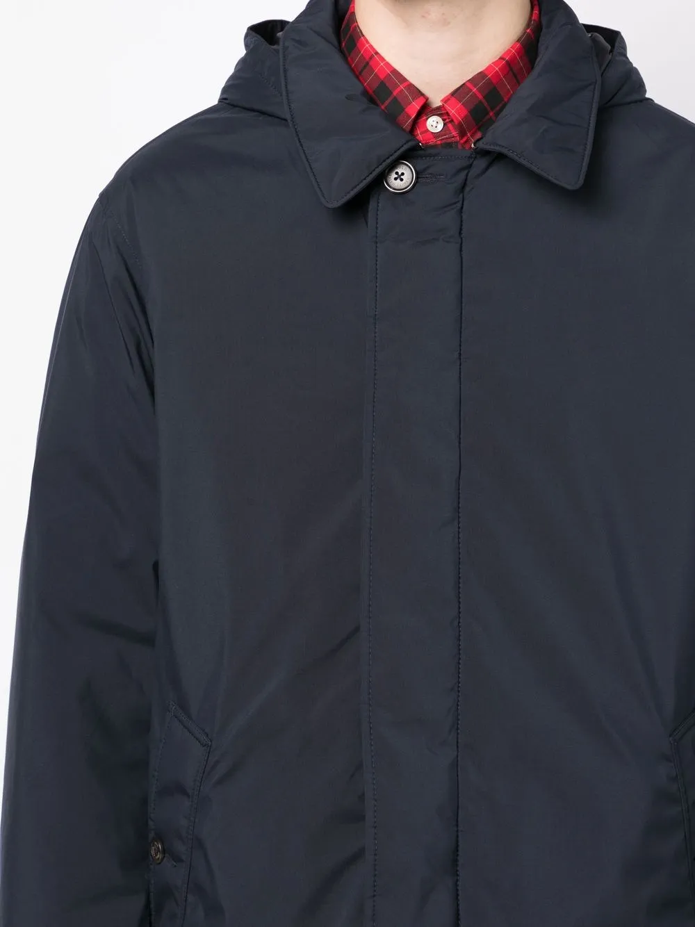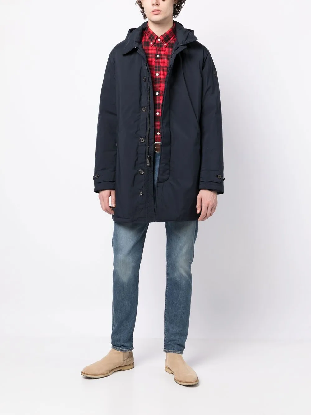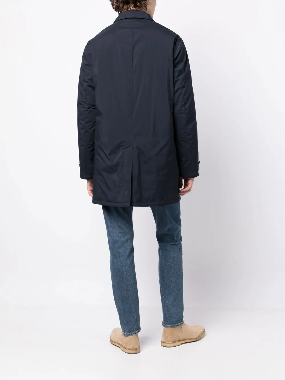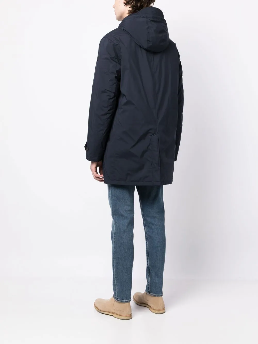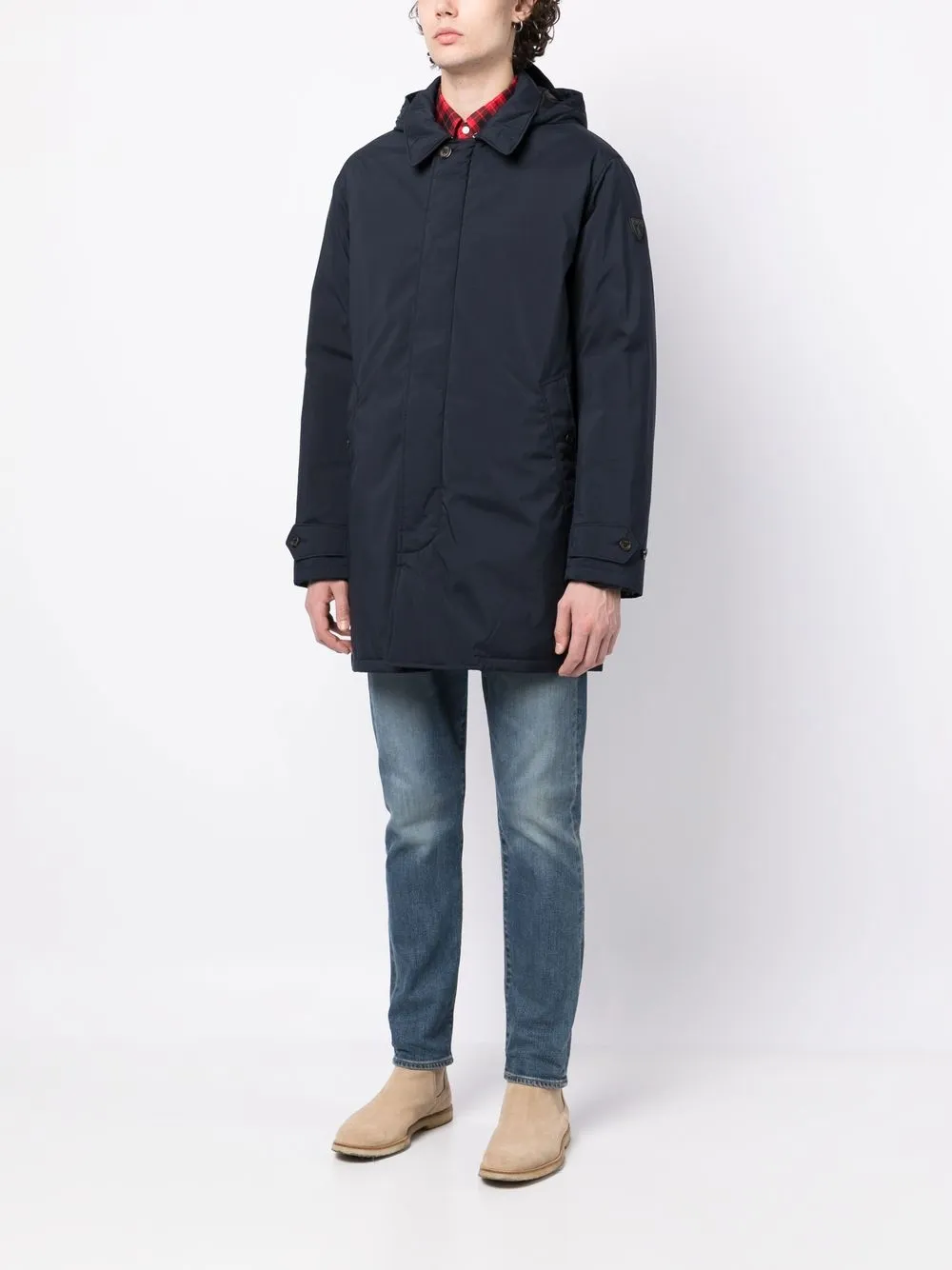 Темно-синий, наполнитель из смеси пуха и пера, двойные стенки с изоляцией, нашивка с логотипом на рукаве, съемный капюшон, классический воротник, застежка на молнии и пуговице спереди, длинные рукава, два кармана на пуговице по бокам, шлица по центру сзади и длина миди. Этот товар как минимум на 50% состоит из переработанных или повторно использованных материалов. Узнать больше о том, какие товары получают отметку «Ответственный выбор», можно из материала «Как мы оцениваем экологичность и этичность».