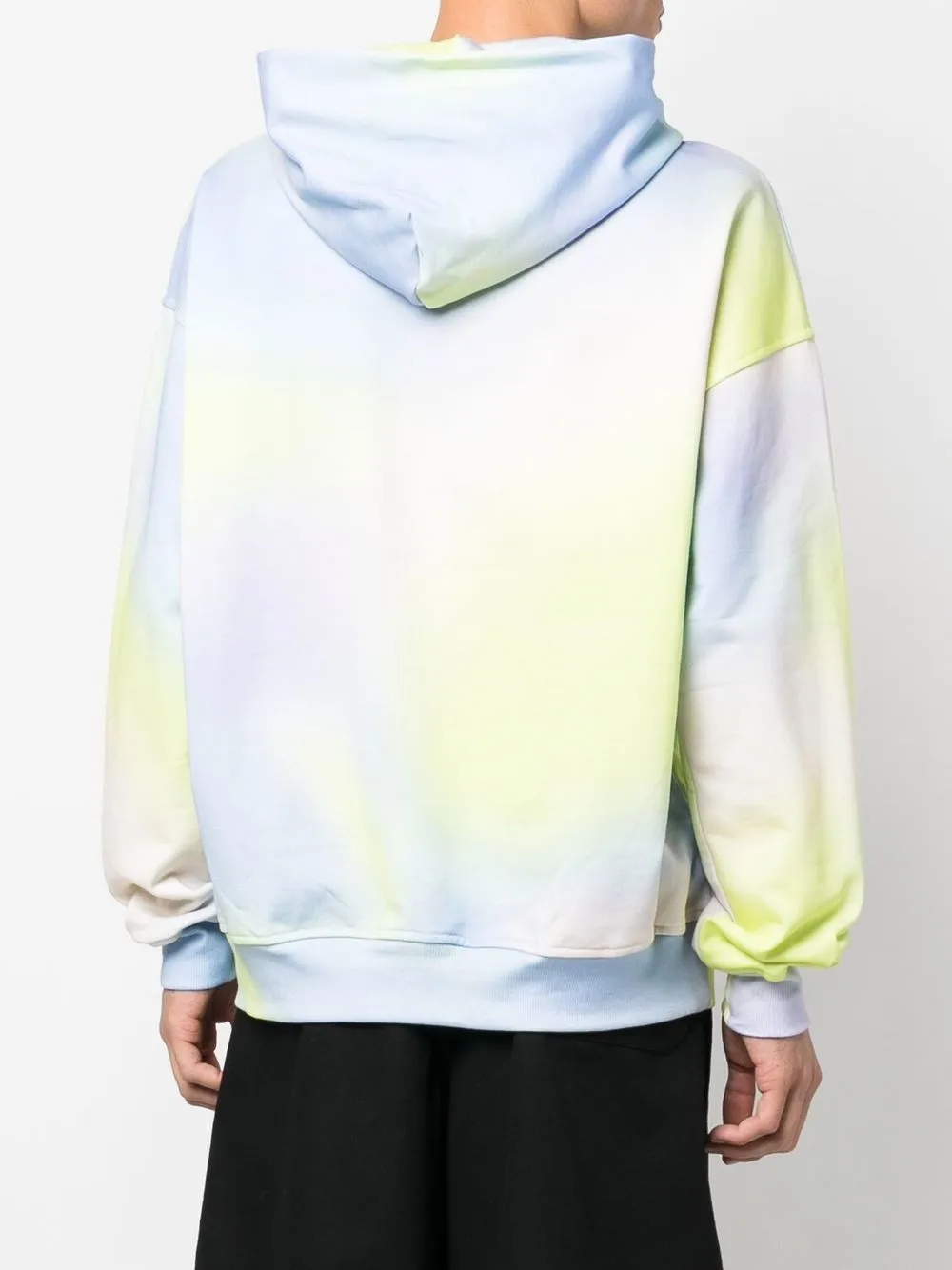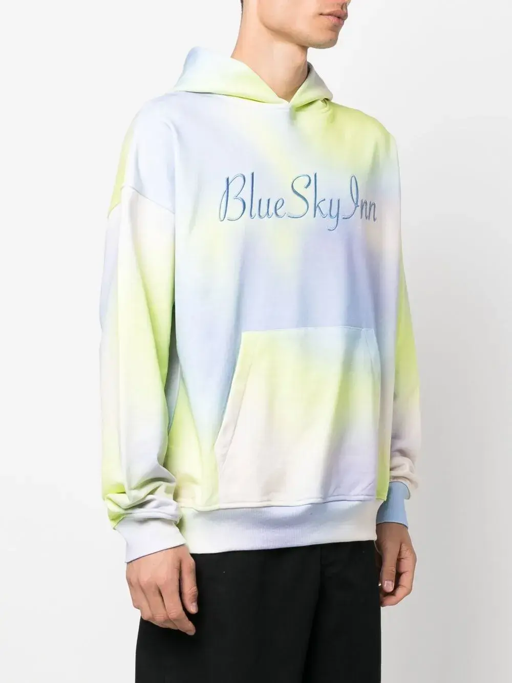 Голубой, канареечный, хлопок, флисовый материал, вышитый логотип спереди, принт тай-дай, классический капюшон, длинные рукава, карман-муфта и отделка в рубчик.