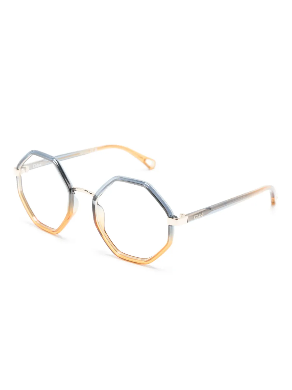 Голубой, светло-оранжевый, ацетат, градиентный эффект, прозрачные линзы, оправа геометрической формы, логотип на дужке, прямые дужки и дужки с закругленными концами. Обратите внимание, что на FARFETCH продаются оправы с линзами без диоптрий. В комплект входит защитный чехол для очков.