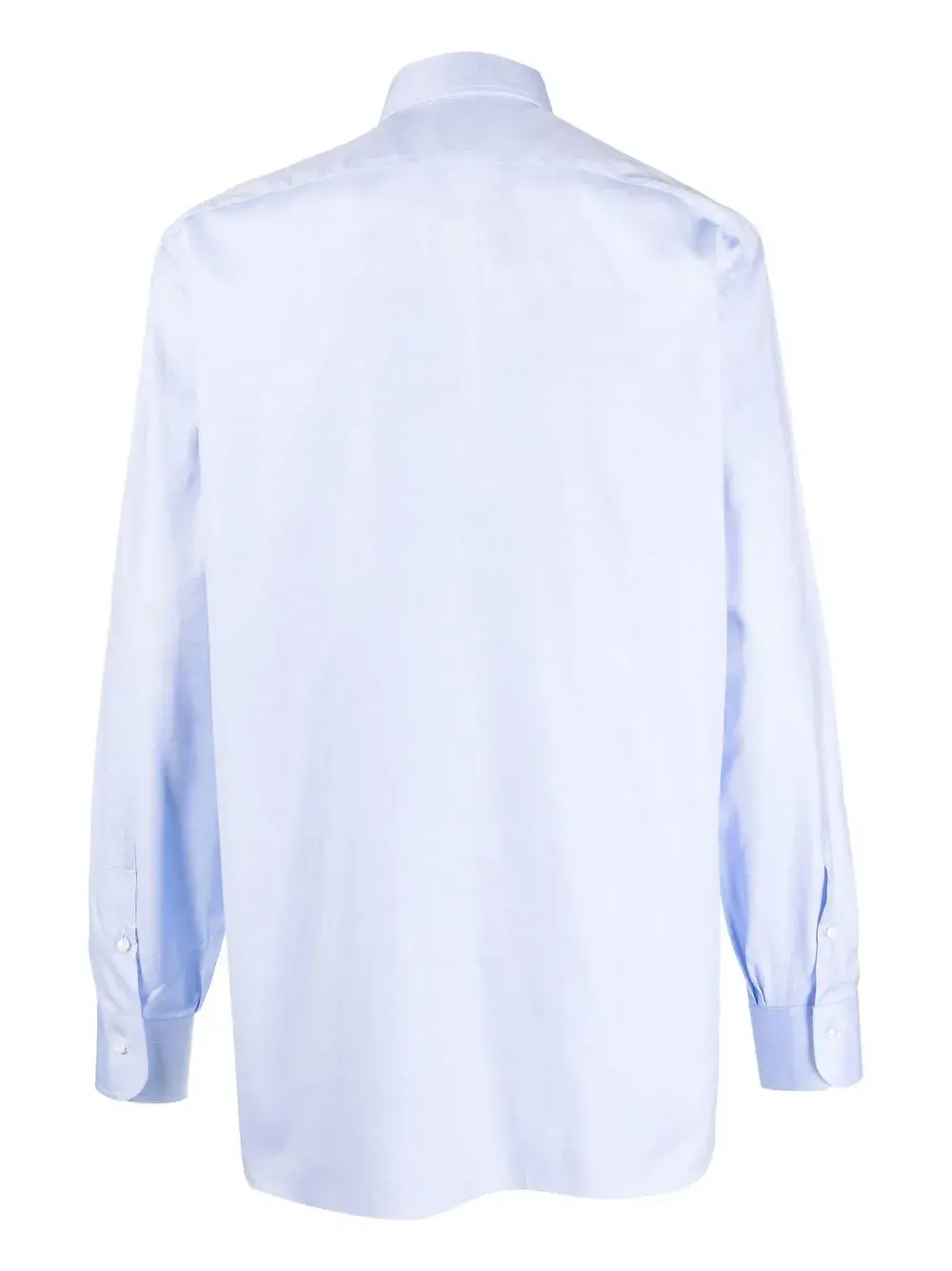 Голубой, хлопок, поплин, прямой воротник, воротник на пуговицах, длинные рукава, застежка на пуговицах спереди, манжеты на пуговицах и закругленный подол.