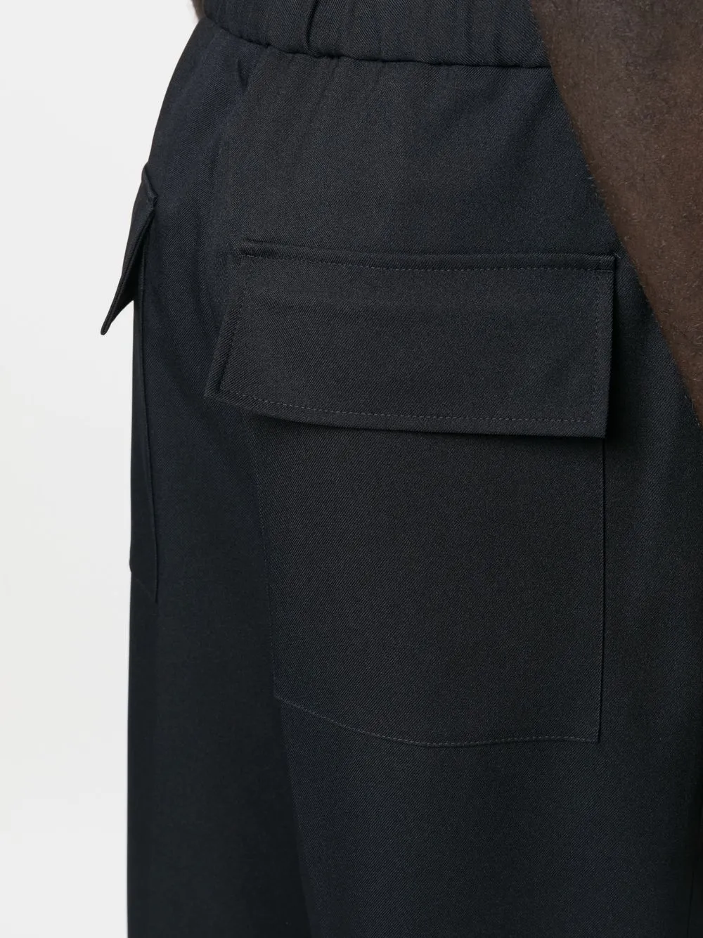 Темно-синий, смесовый хлопок, эластичный пояс, два кармана по бокам, два кармана с клапанами сзади и укороченная длина.