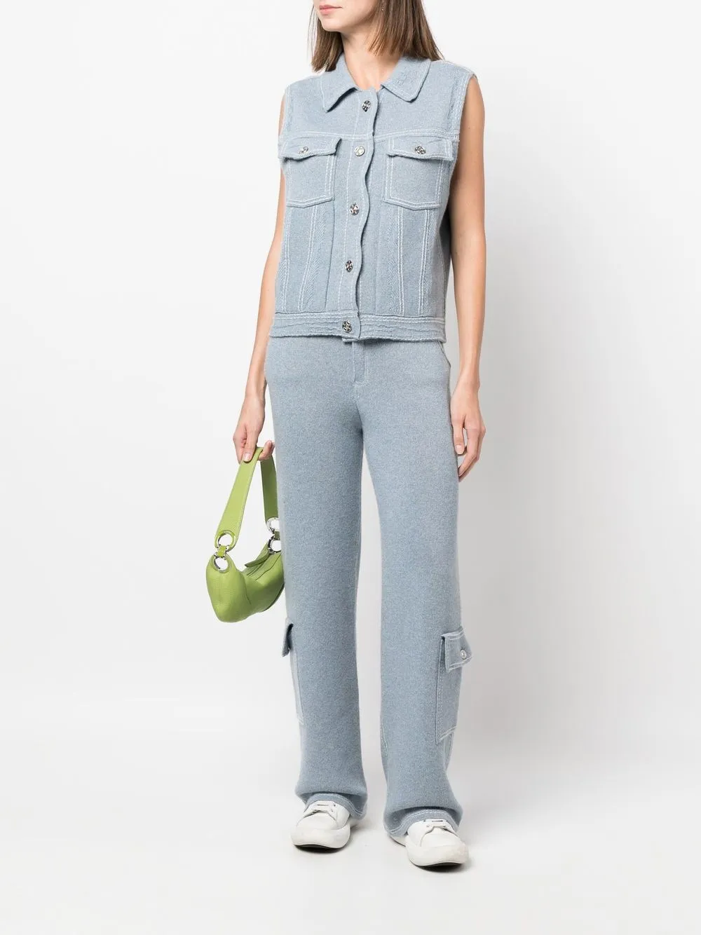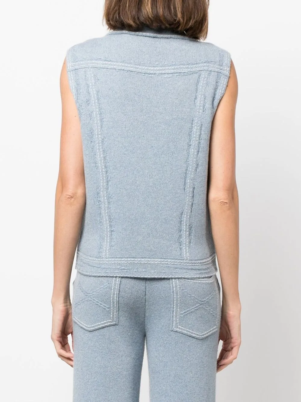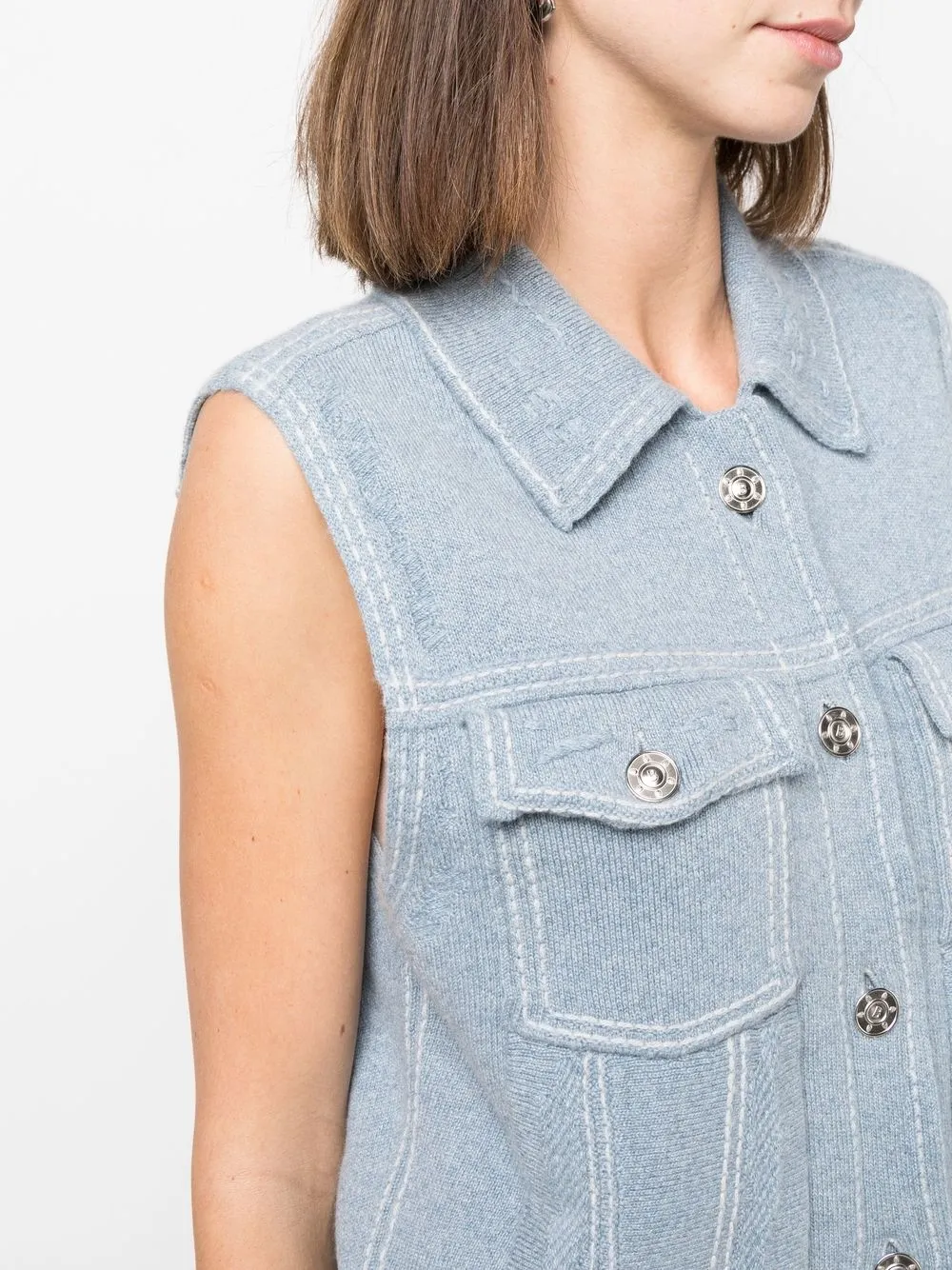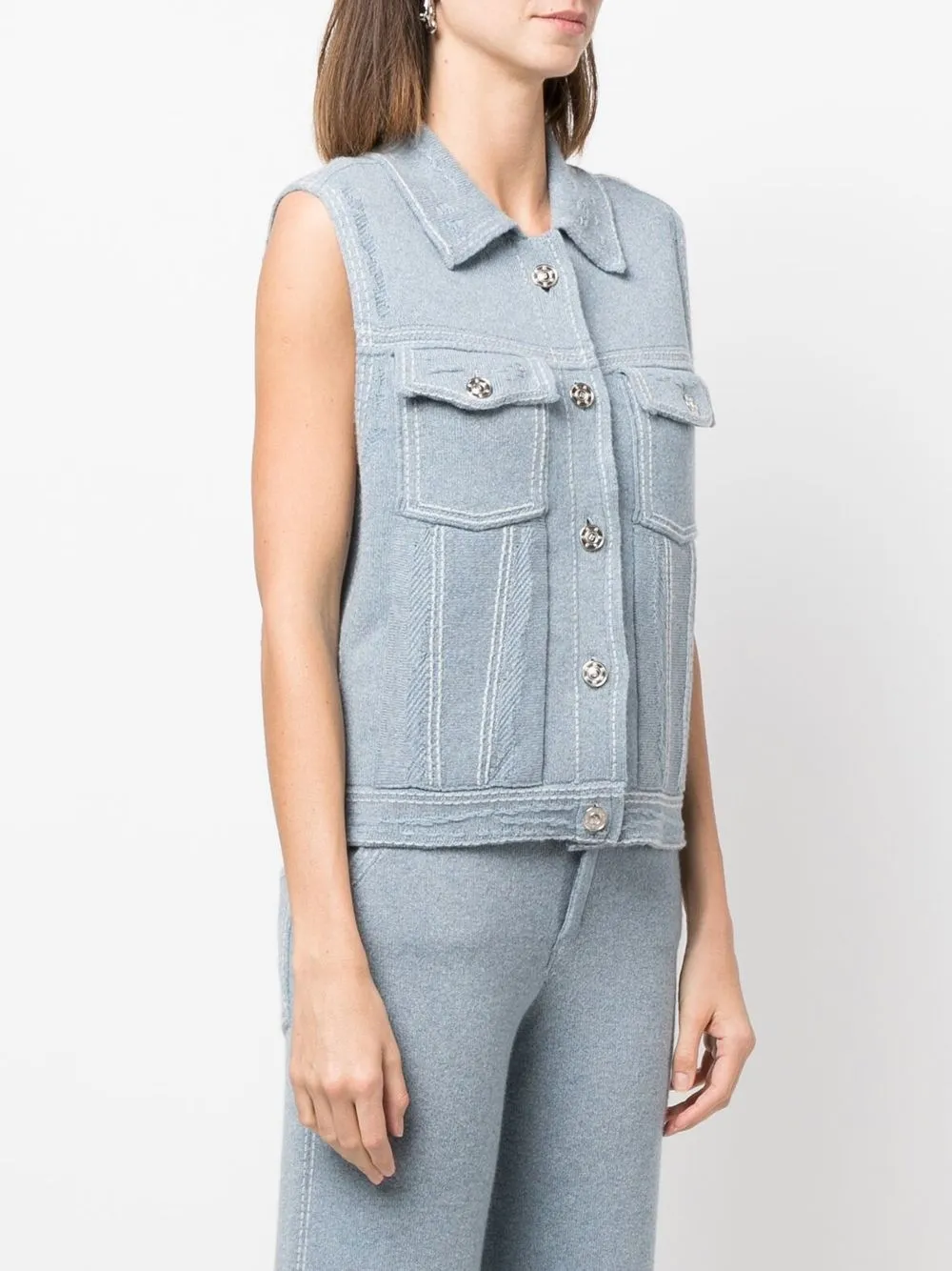 Смесь хлопка и кашемира, тонкая вязка, контрастная строчка, серебристые пуговицы с тиснением, классический воротник, застежка на пуговицах спереди, без рукавов, два нагрудных кармана с клапанами и прямой подол.