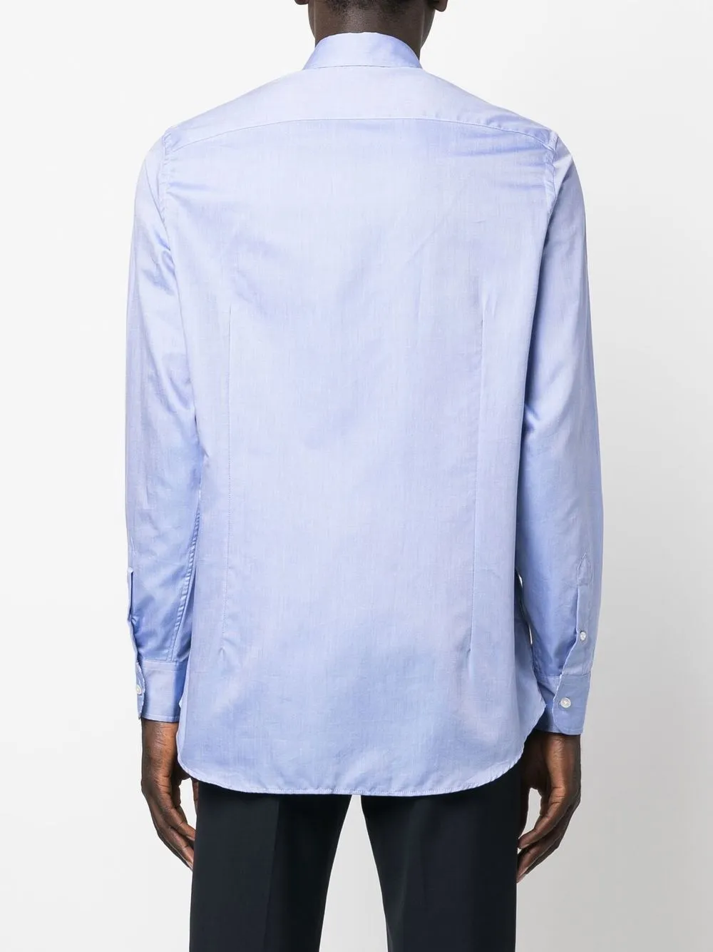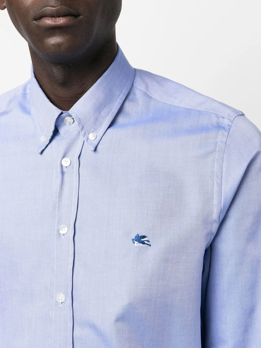 Синий, хлопок, вышитый логотип на груди, узор Pegaso, воротник на пуговицах, застежка на пуговицах спереди, длинные рукава, манжеты на пуговицах и закругленный подол.