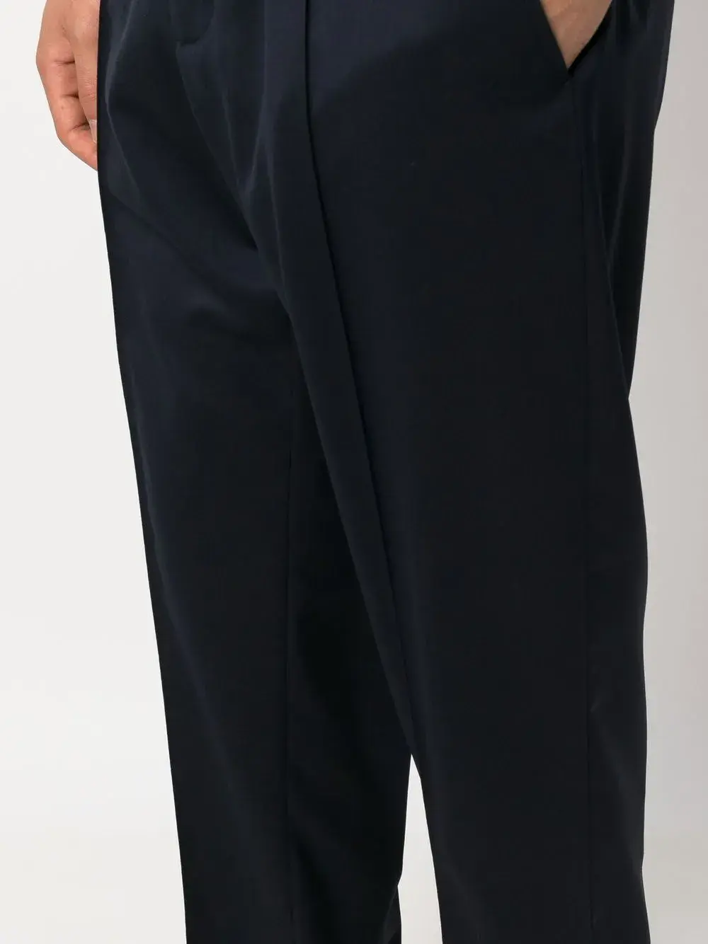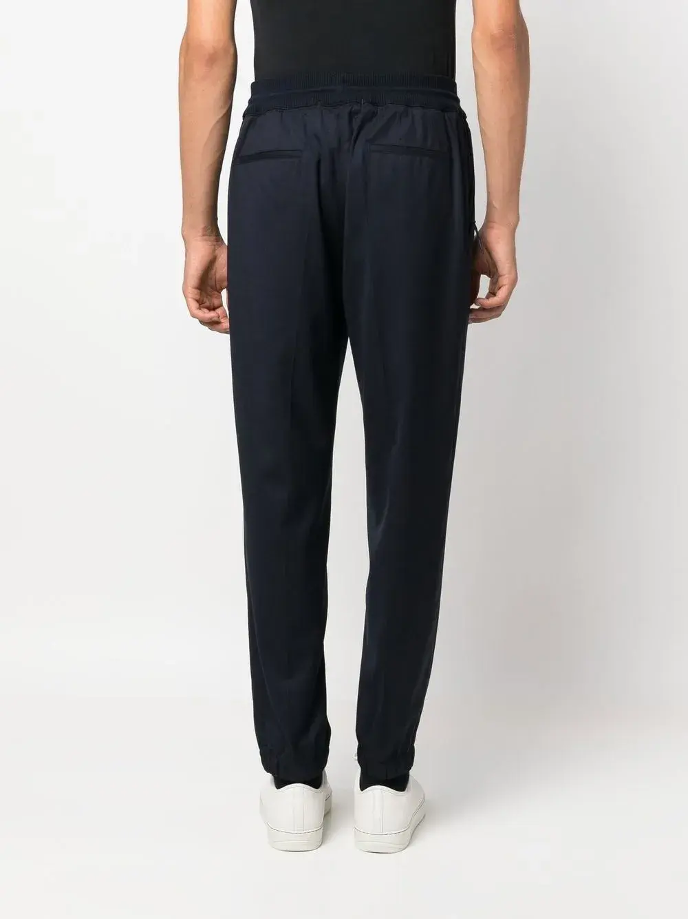 Темно-синий, шерсть, швы, кулиска на талии, зауженный крой, эластичные манжеты, два прорезных кармана по бокам и два кармана с листочкой сзади.