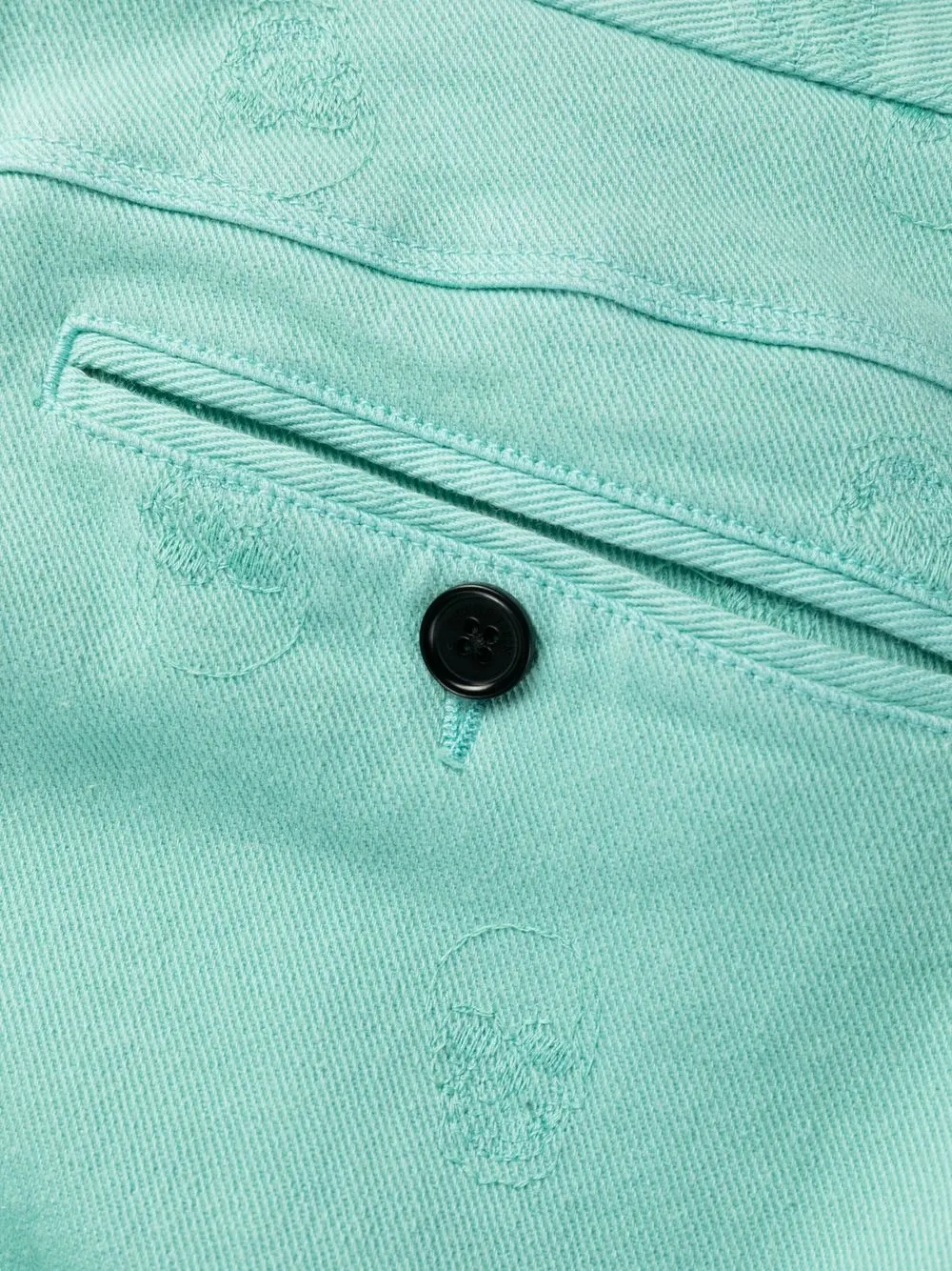 Голубой, смесовый хлопок, вышитый узор, средняя посадка, потайная застежка спереди, петли для ремня, пять карманов и прямой крой.