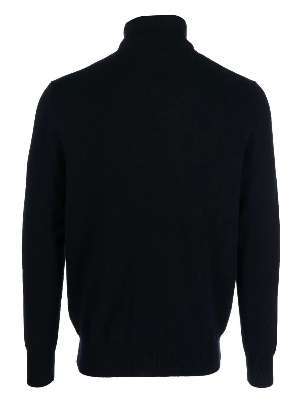 Темно-синий, кашемир, тонкая вязка, отделка в рубчик, высокий воротник, длинные рукава и прямой подол.