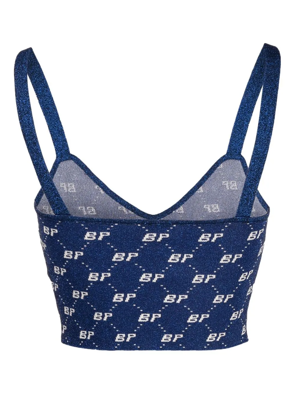 Синий, белый, эластичный материал, ткань в мелкий рубчик, люрекс, логотип в технике интарсия, тонкие бретели и укороченная длина.