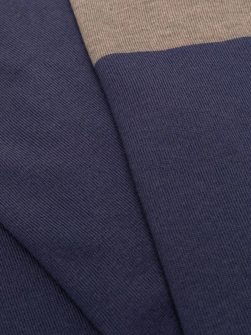 Темно-синий, бежевый, шерсть, трикотажный материал, вязка в технике интарсия, сочетание двух оттенков и обработанные края.