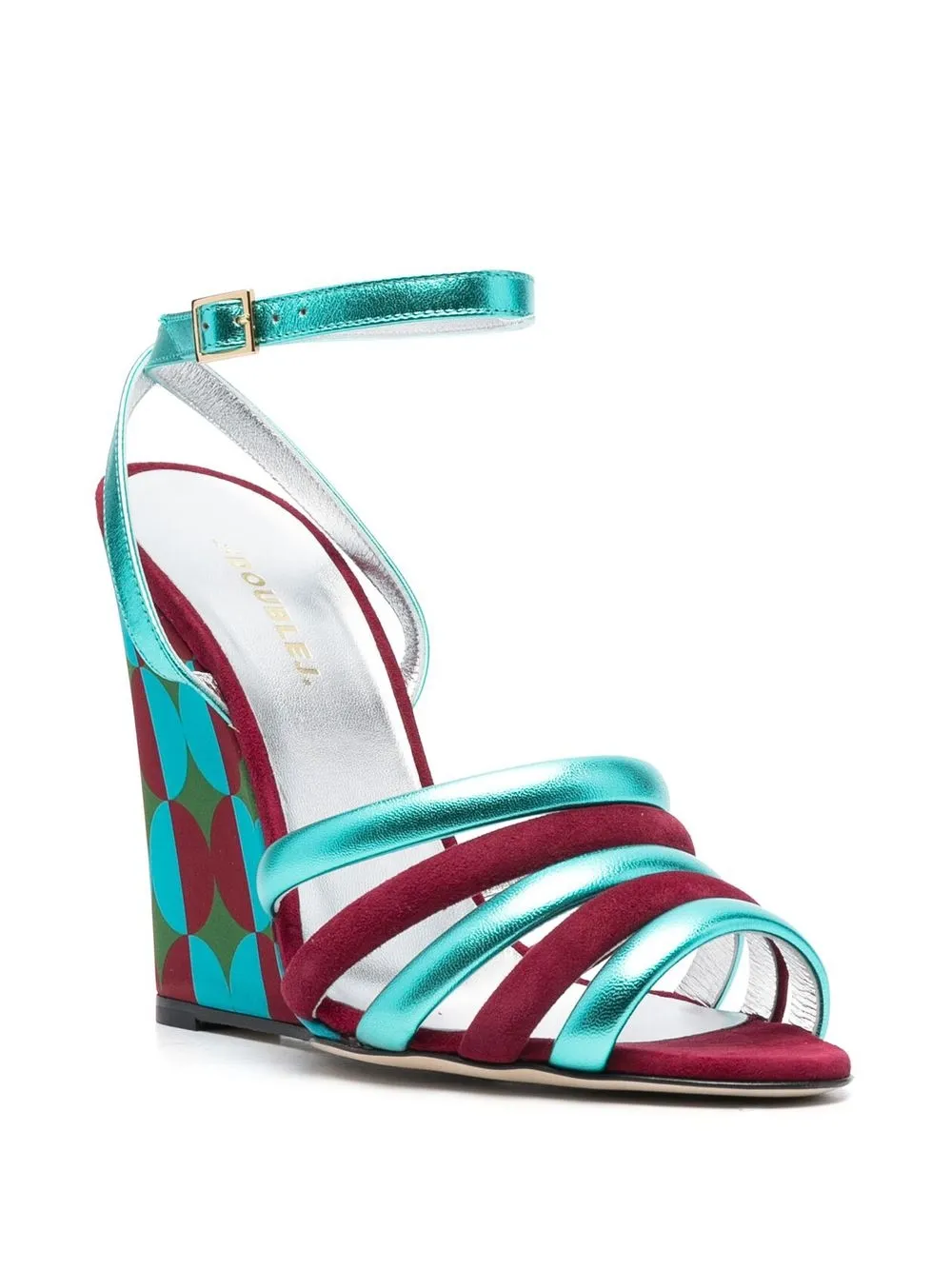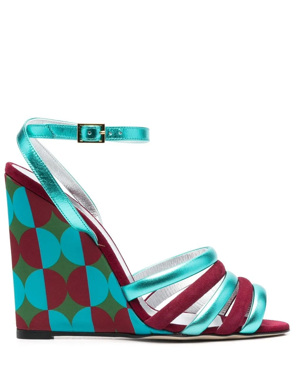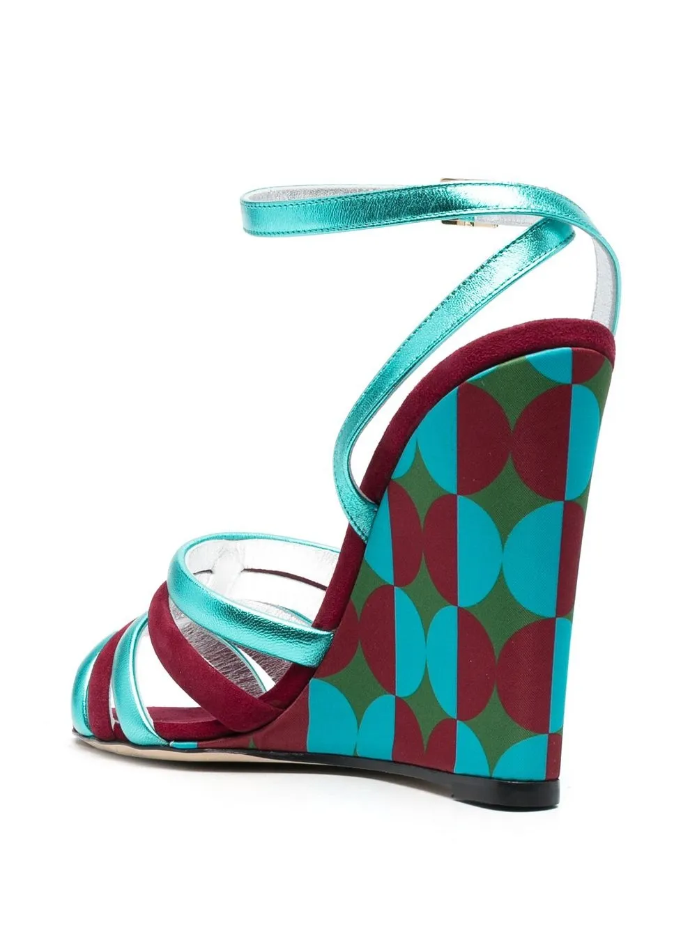 Синий, красный, зеленый, замша, покрытие с эффектом металлик, абстрактный принт, закругленный носок, ремешок на щиколотке с пряжкой, логотип на стельке и высокая танкетка.