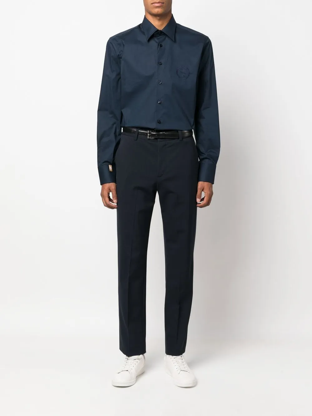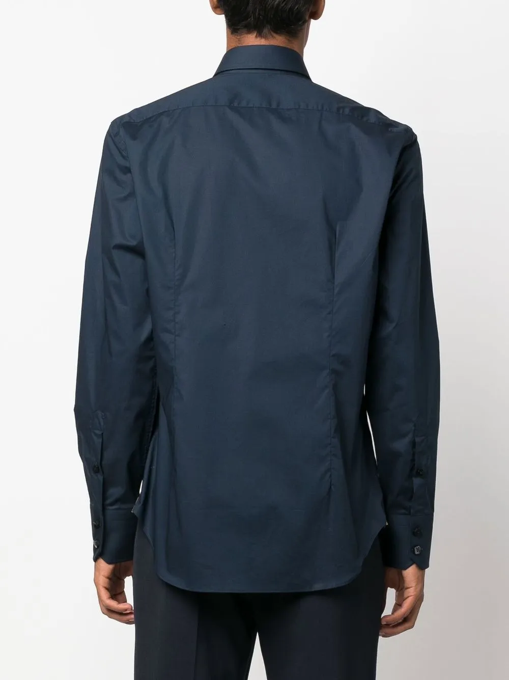 Темно-синий, эластичный хлопок, классический воротник, длинные рукава, застежка на пуговицах спереди и закругленный подол.