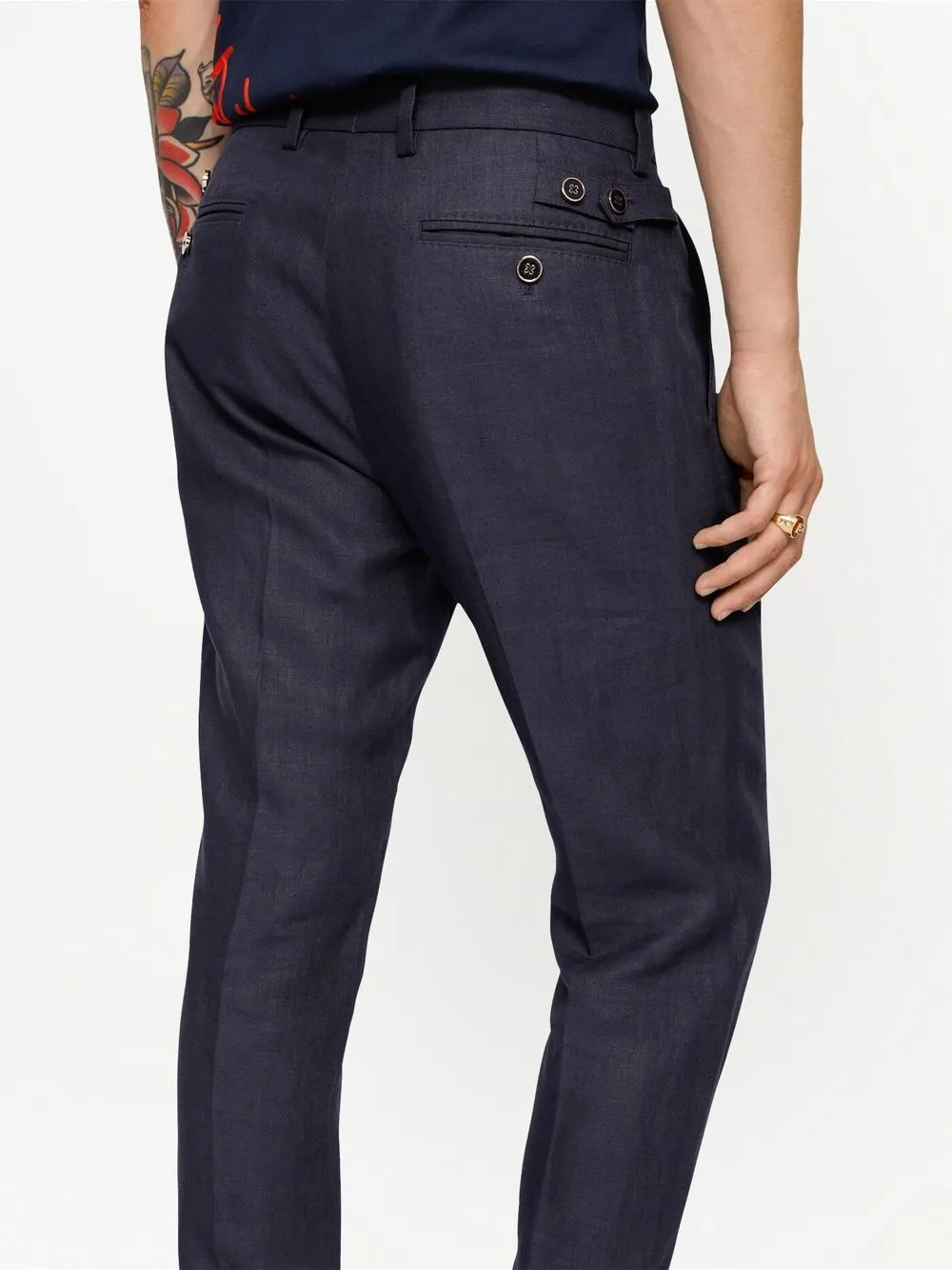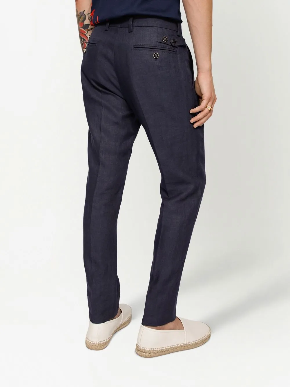Подробнее о товаре: Темно-синий, лен, узкий крой, средняя посадка, петли для ремня, застежка на молнии и пуговице спереди, два прорезных кармана по бокам и два кармана на пуговице сзади. Ответственный выбор: Этот товар как минимум на 50% состоит из материалов, которые признаны более безопасными для окружающей среды или сертифицированы независимыми организациями.