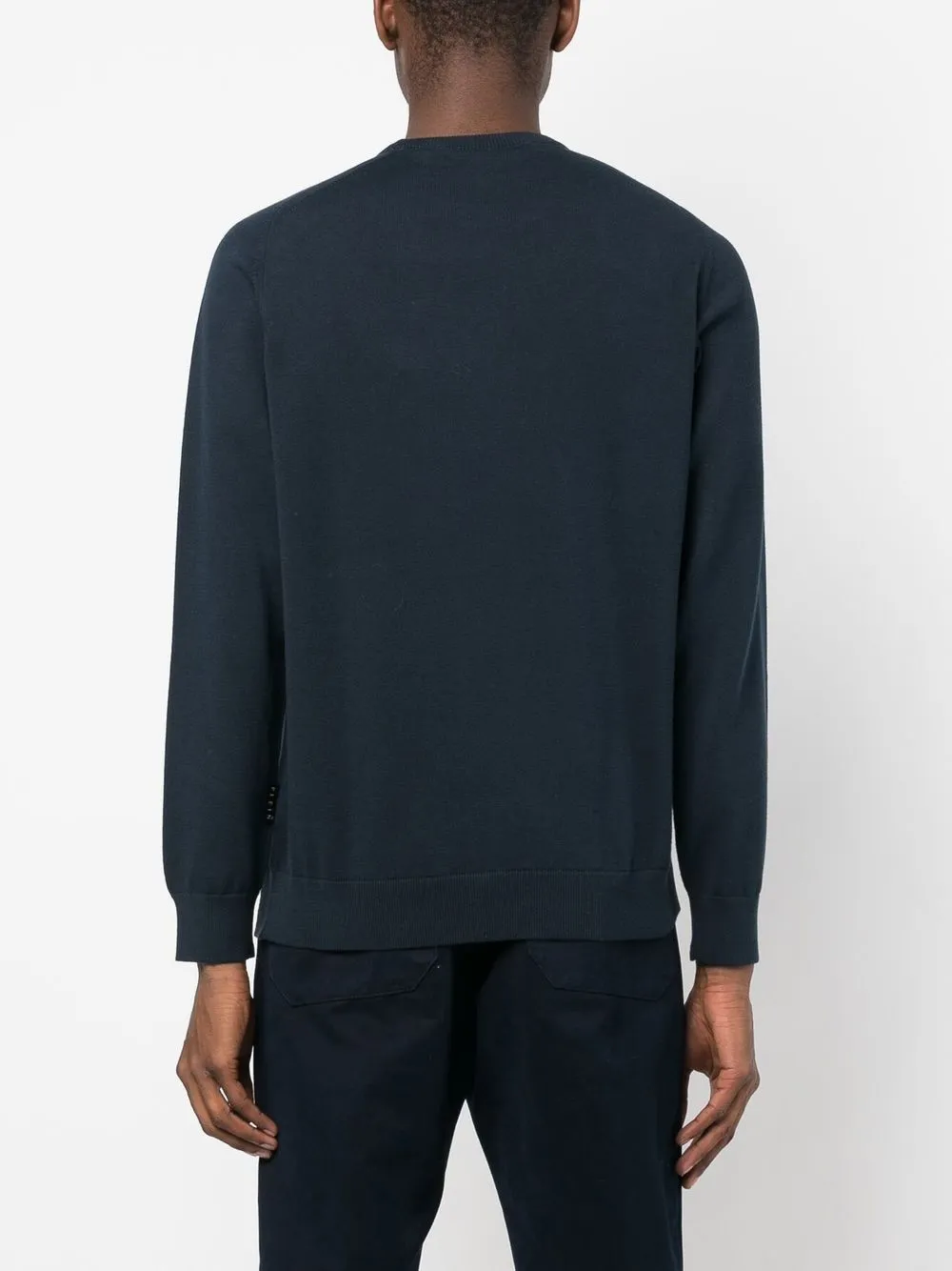Темно-синий, хлопок, металлический логотип, круглый вырез, длинные рукава, манжеты в рубчик и подол в рубчик.