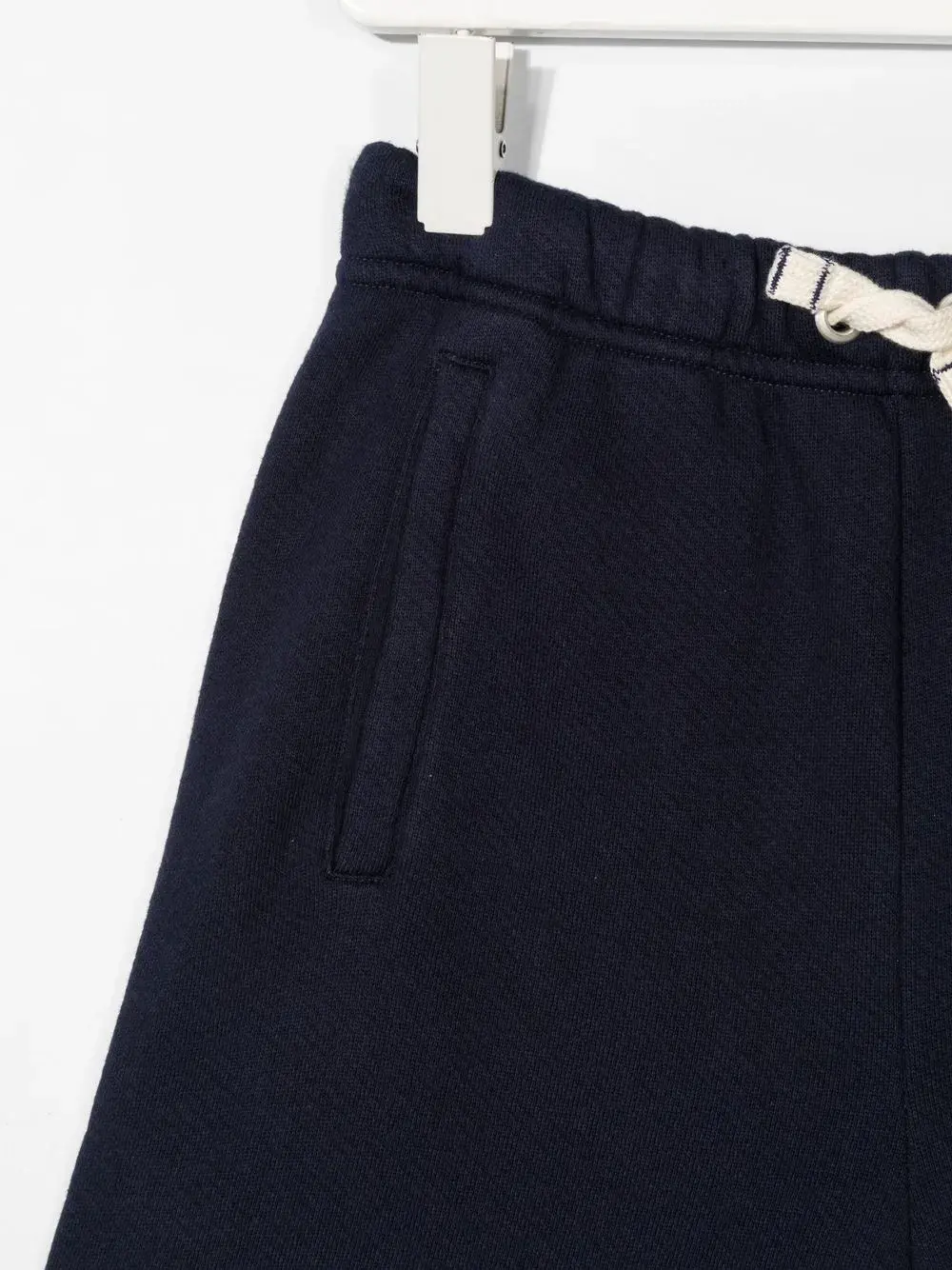 Темно-синий, хлопок, логотип спереди, принт с логотипом сзади, кулиска на талии и два прорезных кармана по бокам.