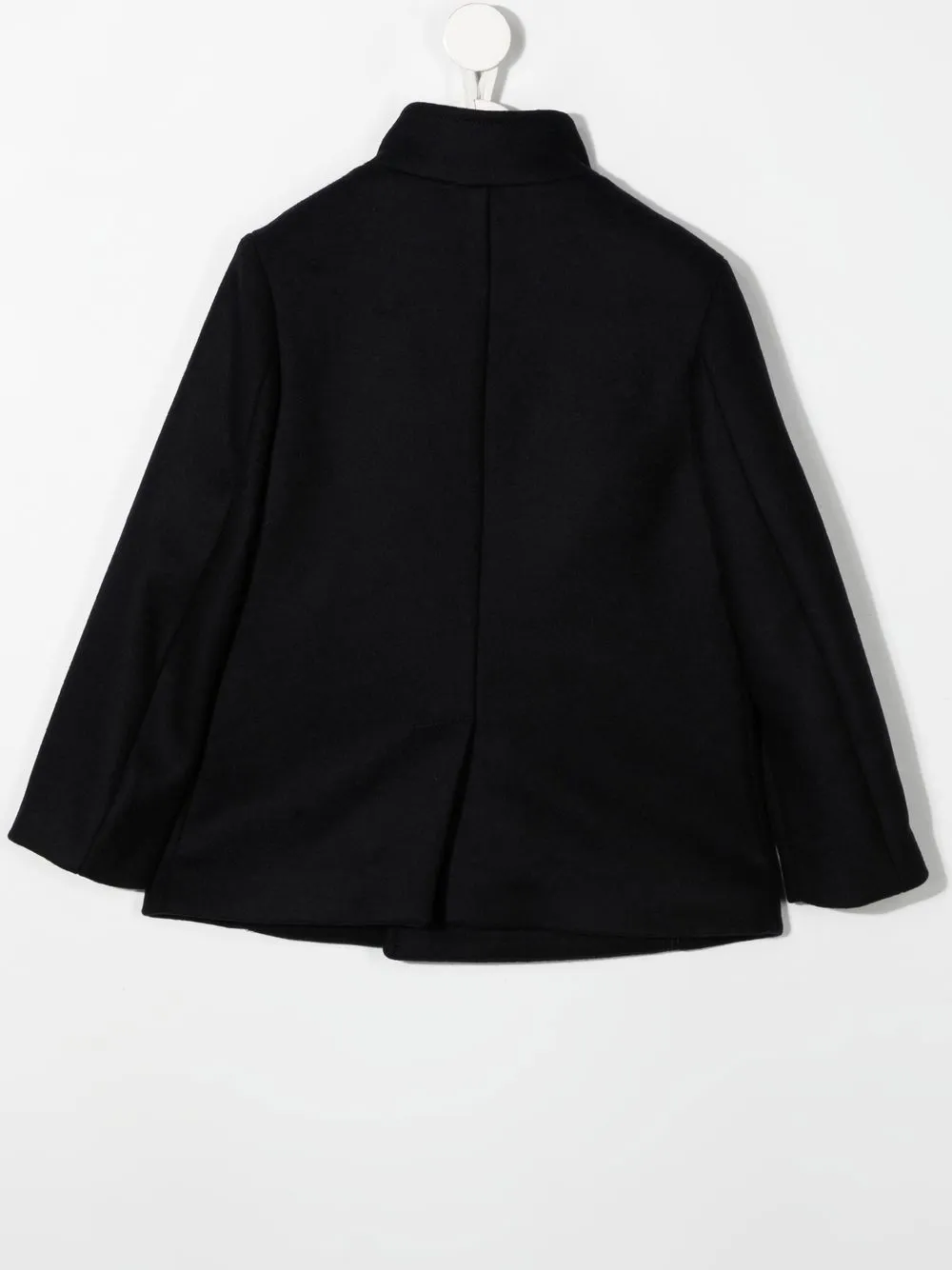Темно-синий, смесовая шерсть, высокий воротник, двубортная застежка на кнопки, длинные рукава и прямой подол.