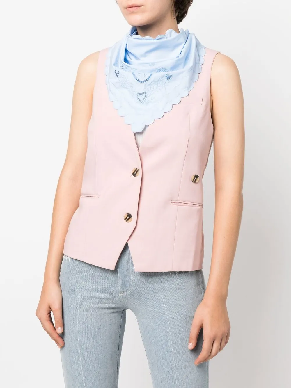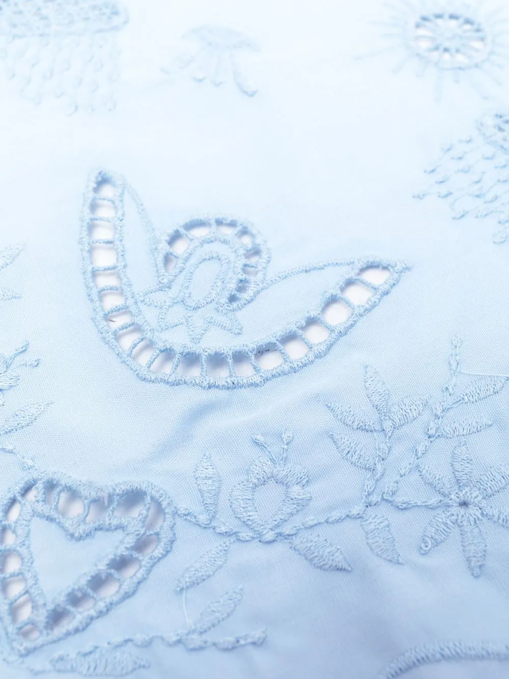 Голубой, хлопок, английская вышивка, цветочная вышивка, нашивка с логотипом сбоку и края с фестонами.