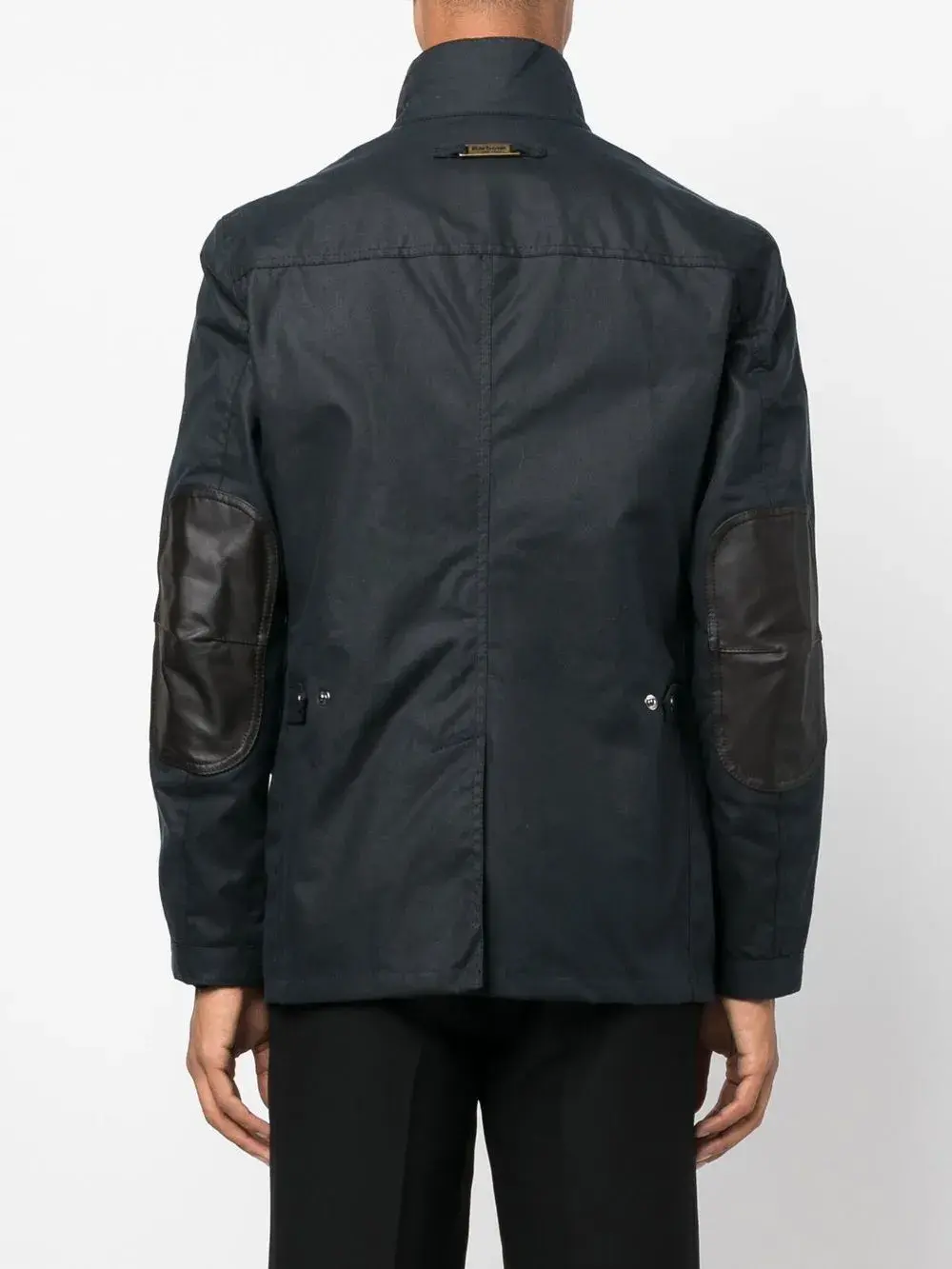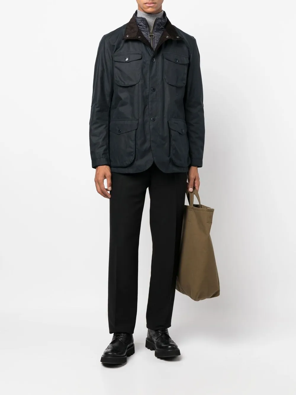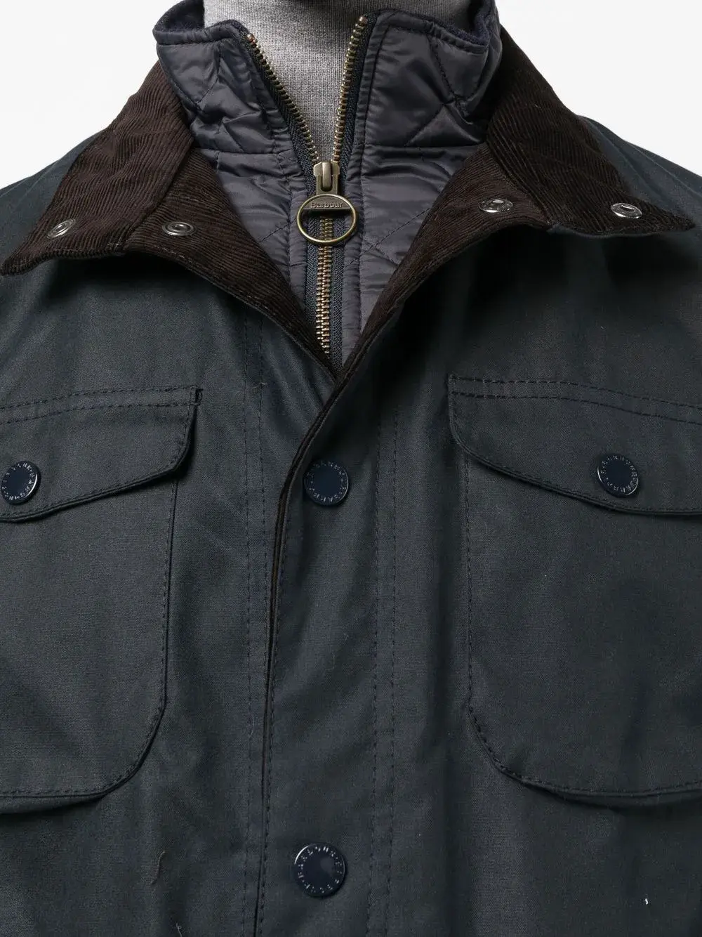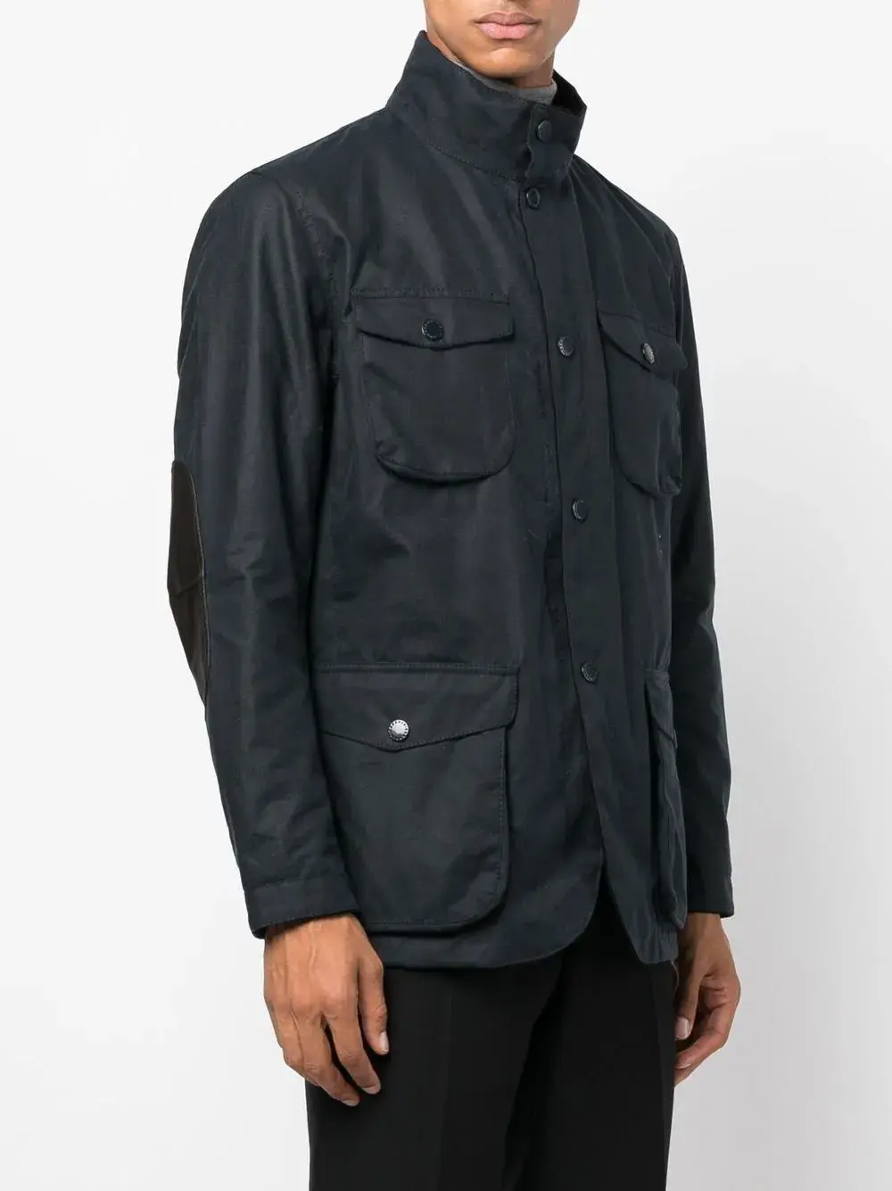 Темно-синий, хлопок, круглый вырез, застежка на зажиме, длинные рукава, два передних кармана и два накладных кармана на груди.