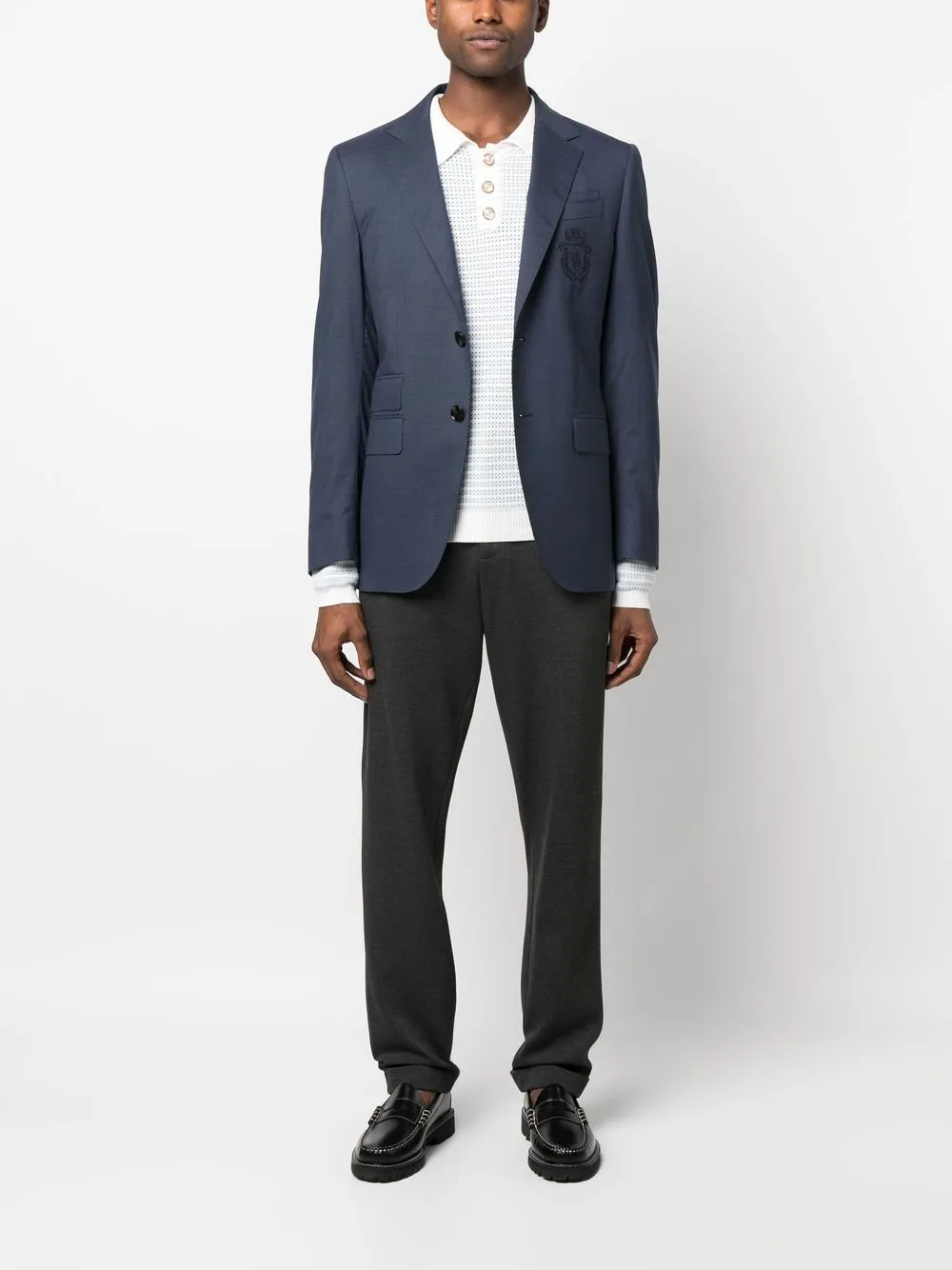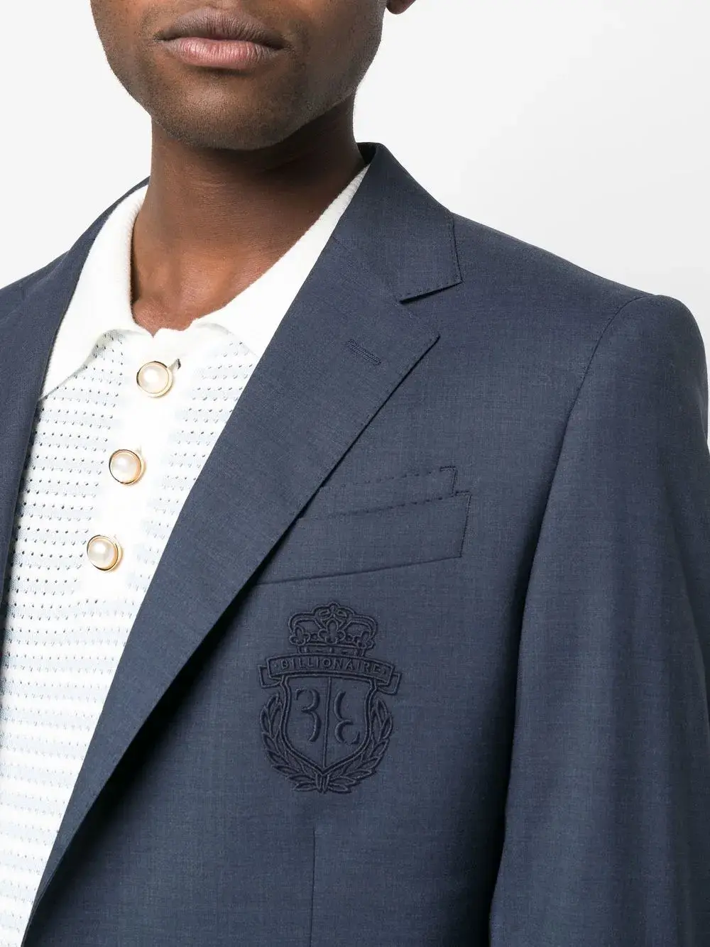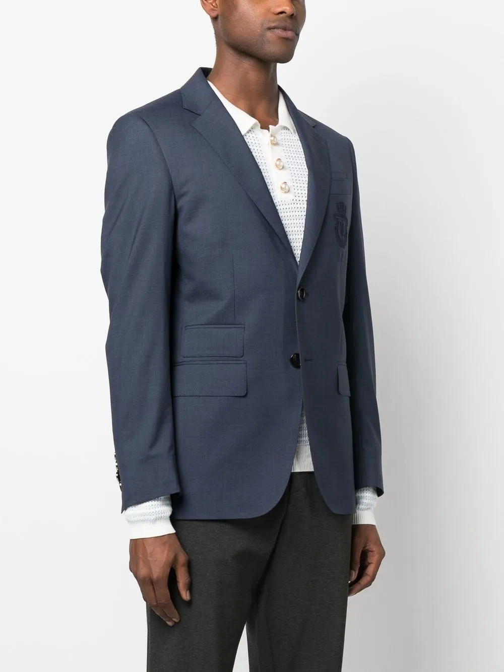 Синий, узор с эмблемой, зазубренные лацканы, застежка на пуговицах спереди, длинные рукава, прорезной карман на груди, два передних кармана с клапанами, шлица по центру сзади и атласная подкладка.