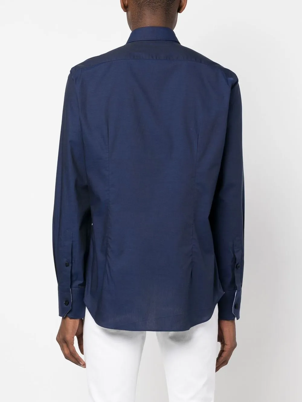 Темно-синий, золотистый, эластичный хлопок, вышитый логотип на груди, классический воротник, застежка на пуговицах спереди, длинные рукава и закругленный подол.