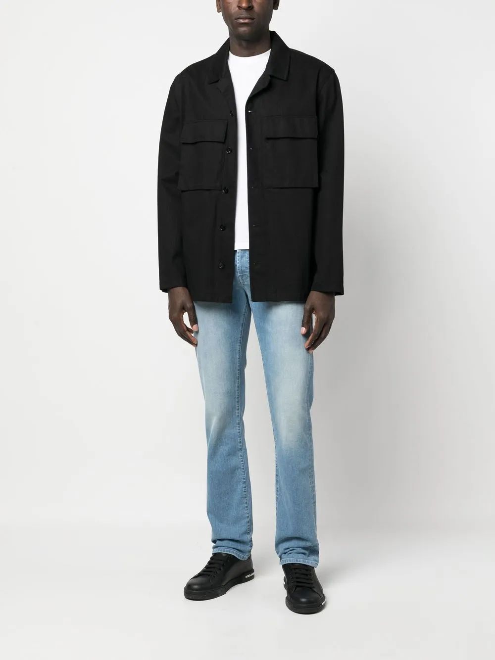 Вышитый логотип сзади, петли для ремня, застежка на молнии и пуговице спереди и пять карманов.