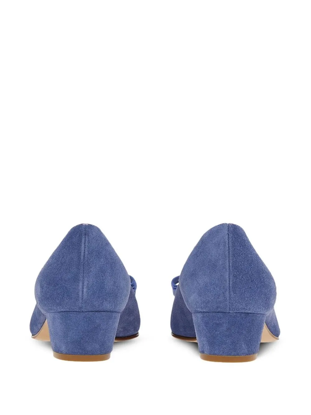 Синий, замша, кожа, бант, миндалевидный носок, кожаная стелька с логотипом и низкий блочный каблук.