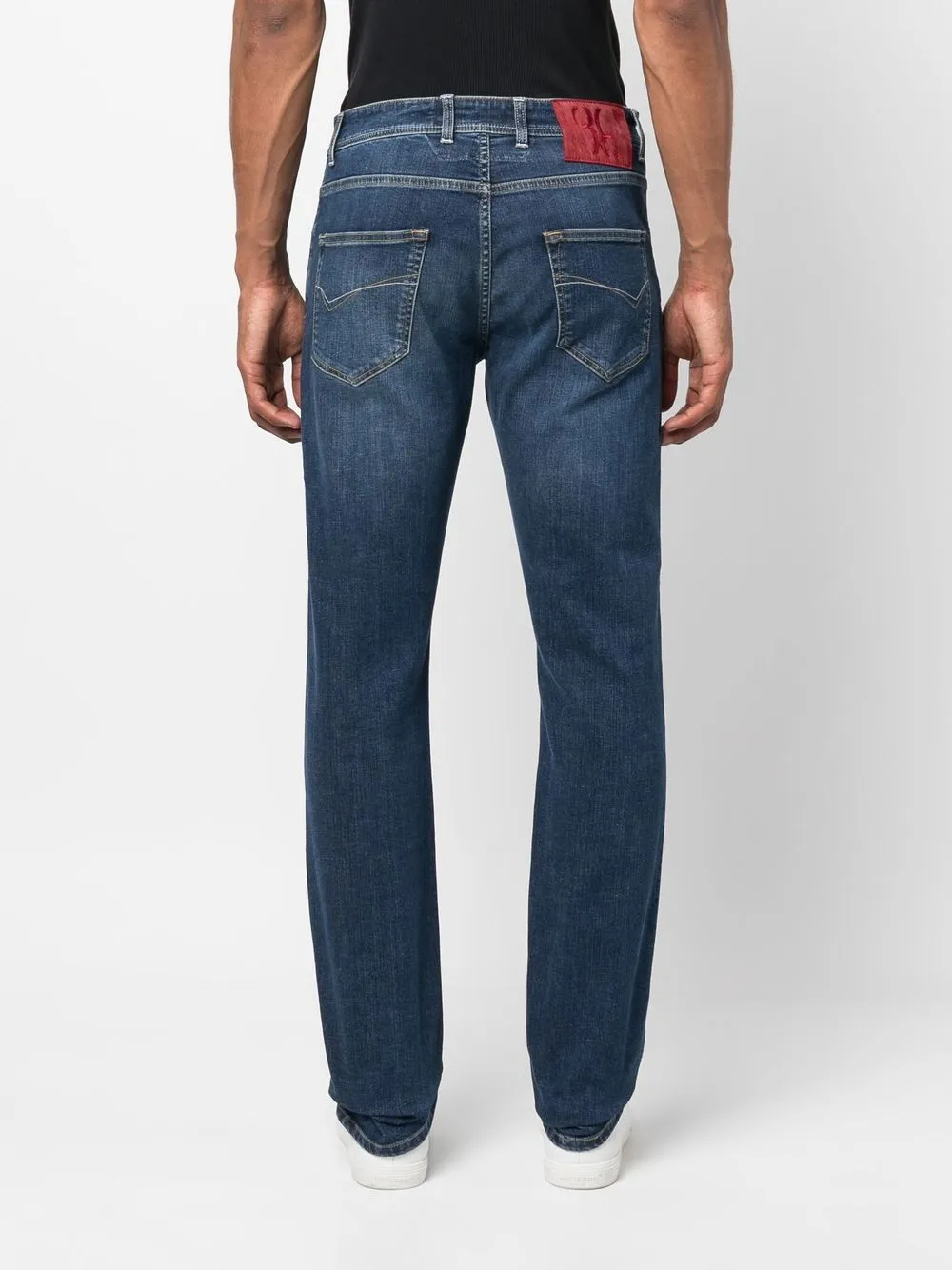 Синий, эластичный хлопок, нашивка с логотипом сзади, средняя посадка, петли для ремня, ширинка на пуговицах, пять карманов и прямой крой.