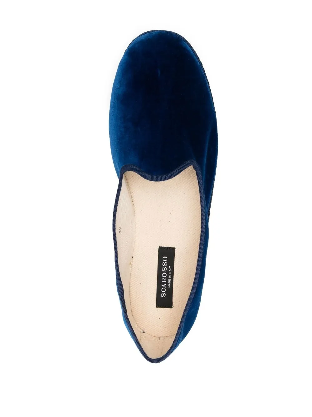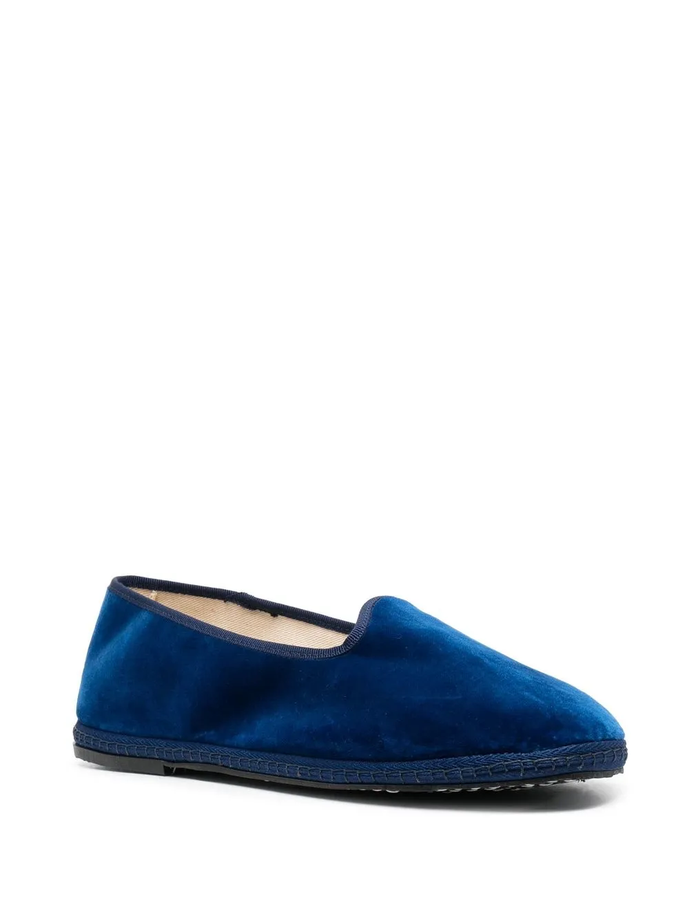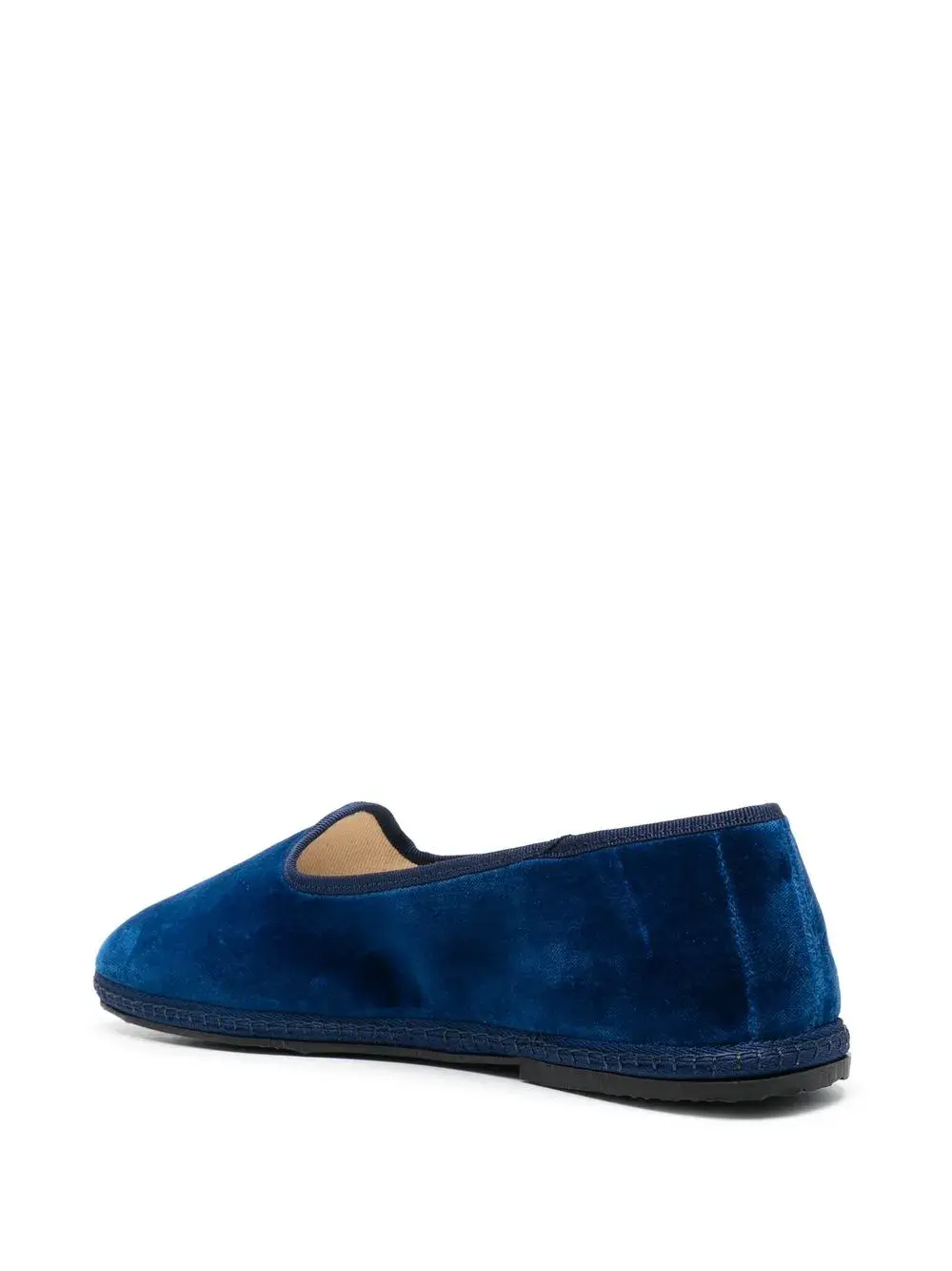 Синий, бархат, миндалевидный носок, модель без застежки и плоская резиновая подошва.