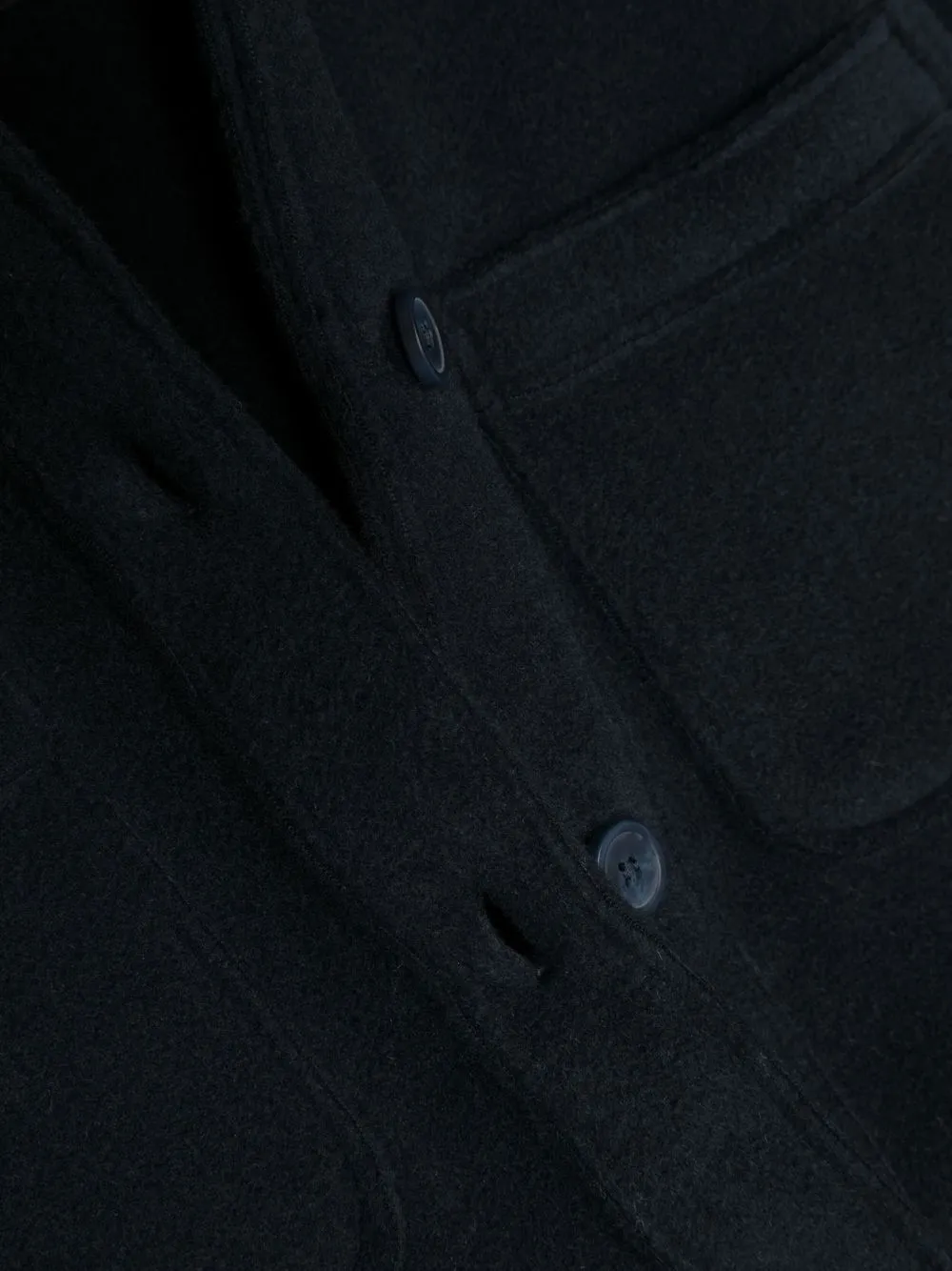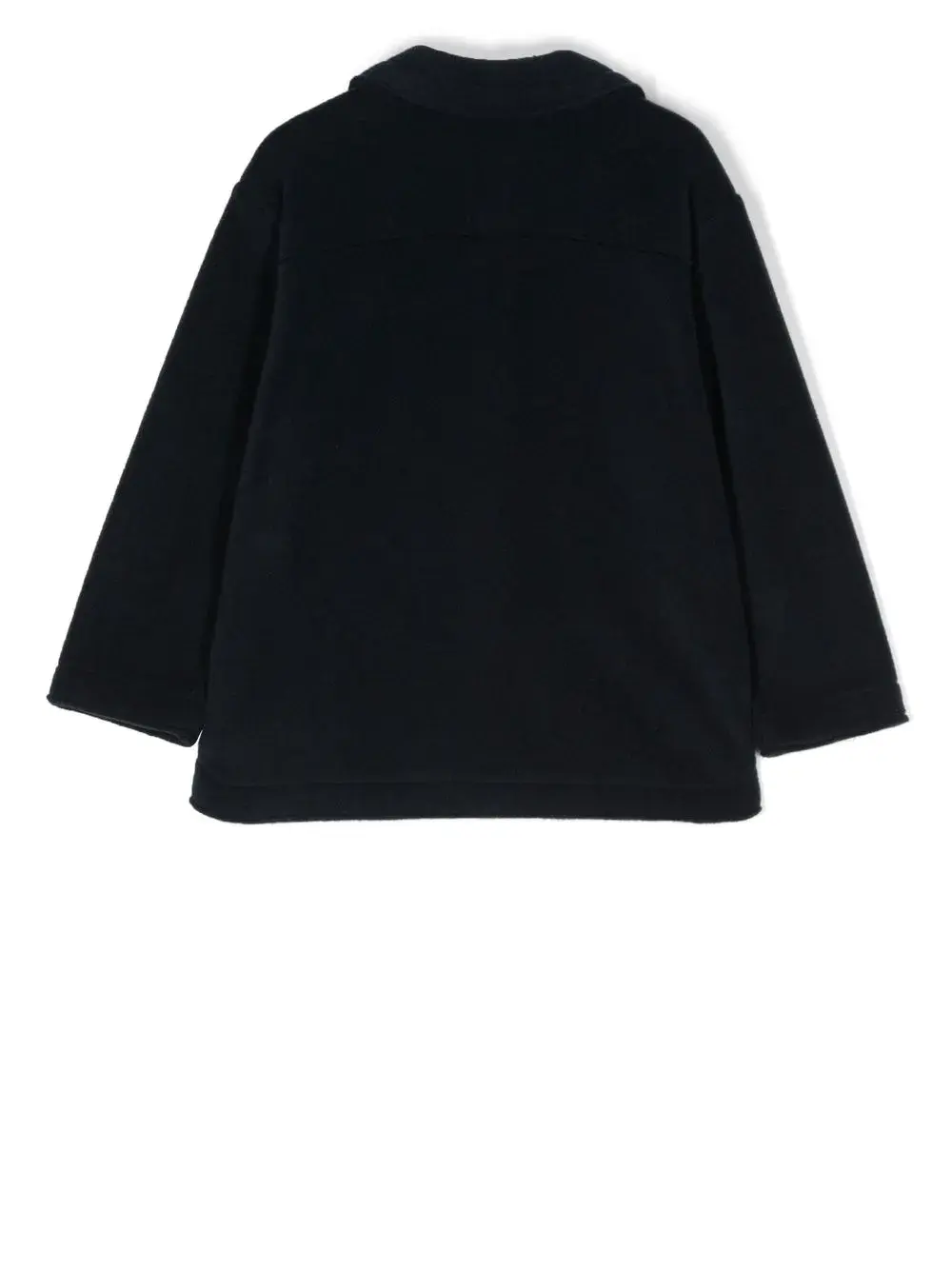 Темно-синий, материал c флисовой текстурой, строчка в тон, закругленный воротник, застежка на пуговицах спереди, два накладных кармана на груди, длинные рукава и прямой подол.