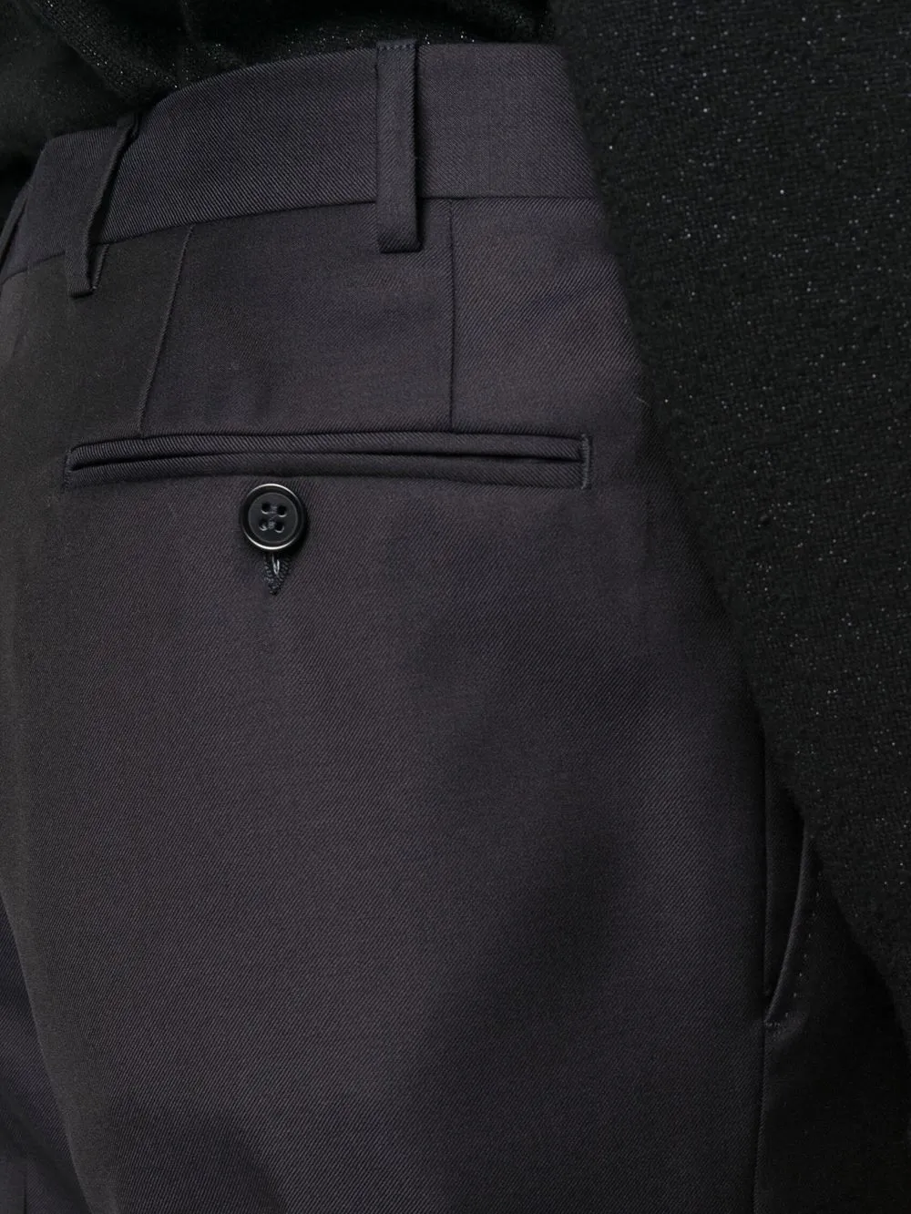 Темно-синий, смесовая шерсть, нашивка с логотипом на рукаве, отложный воротник, застежка на пуговицах спереди, длинные рукава, прорезной карман на груди, два передних кармана с клапанами, прямой подол, петли для ремня, потайная молния спереди, два прорезных кармана по бокам, два кармана с листочкой сзади и прямой крой.