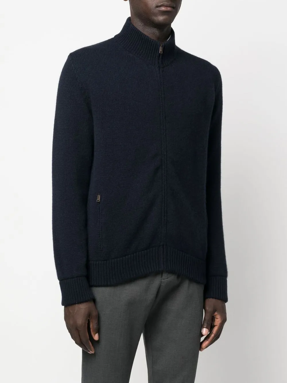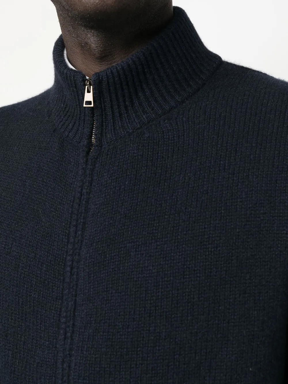 Темно-синий, смесовый кашемир, крупная вязка, вязаные края в рубчик, высокий воротник, застежка на молнии спереди, длинные рукава и прямой подол.