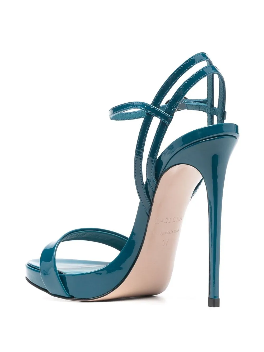 Сине-зеленый, телячья кожа, лакированная отделка, открытый носок, ремешок на щиколотке с пряжкой, каблук на высокой шпильке, кожаная стелька с логотипом, кожаная подошва и подошва на платформе.