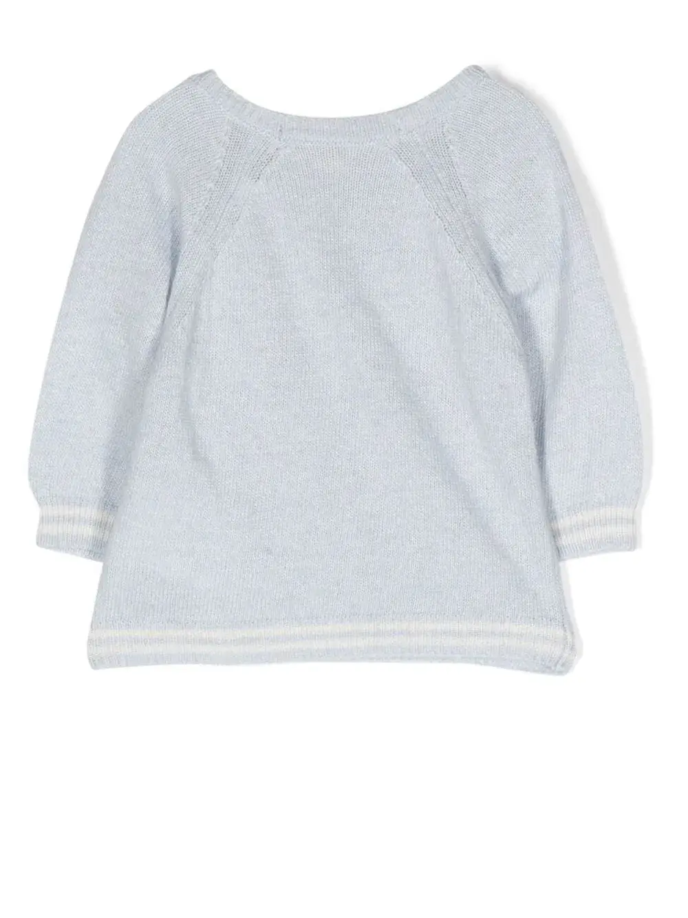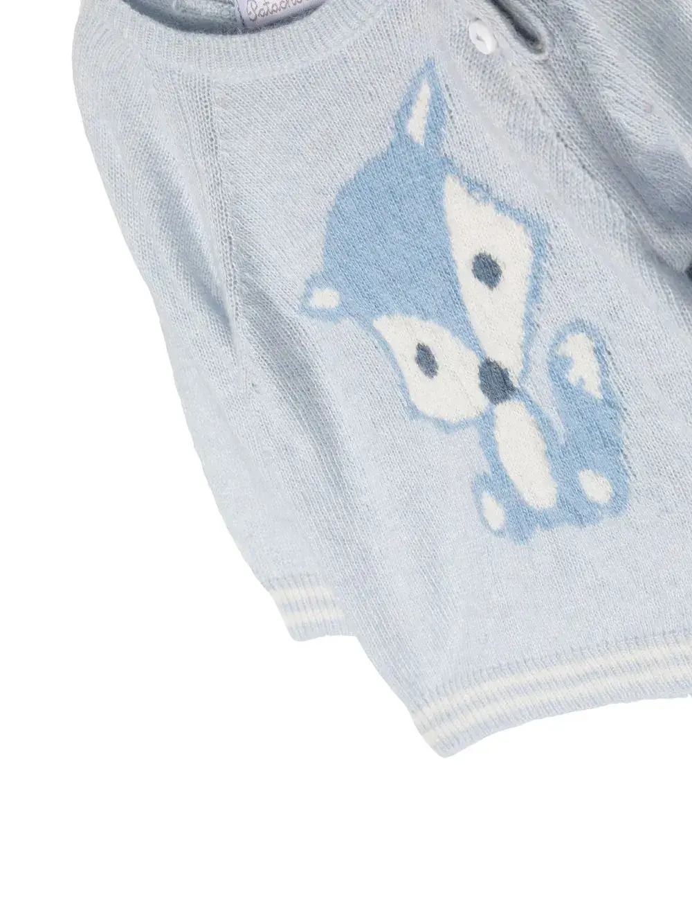 Нежно-голубой, шерсть мериноса, смесовый кашемир, трикотажный материал, матовое покрытие, знаковый узор с изображением лисы, длинные рукава и круглый вырез.