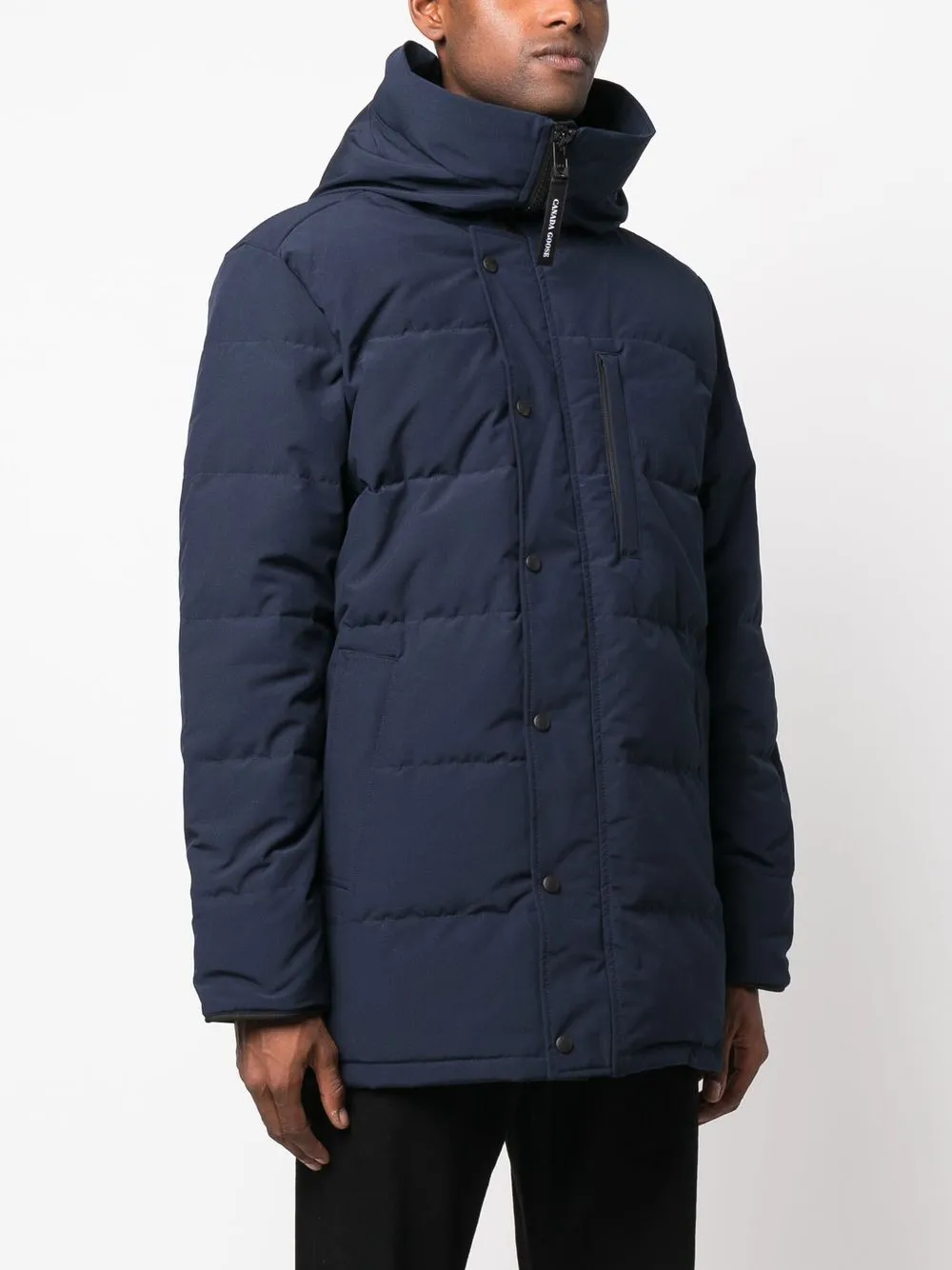 Темно-синий, наполнитель из смеси пуха и пера, дутый материал, стеганая модель, нашивка с логотипом на рукаве, воротник-стойка, застежка на кнопках спереди, съемный капюшон, длинные рукава, два нагрудных кармана на молнии, два вшитых кармана по бокам и прямой подол.