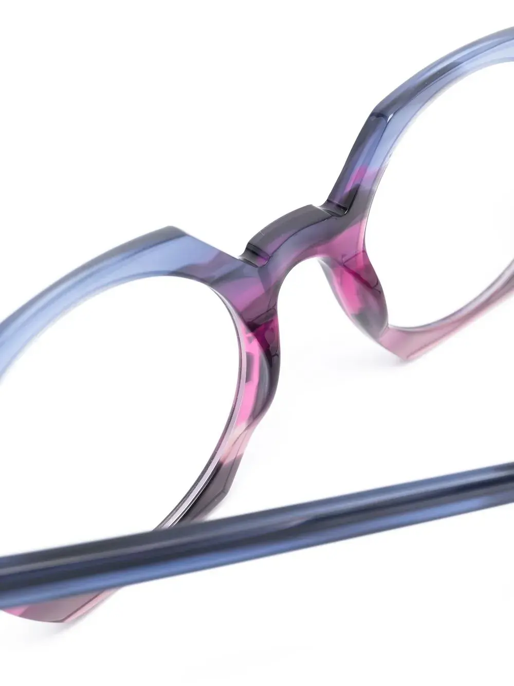 Синий, фиолетовый, ацетат, мраморный узор, оправа геометрической формы, прозрачные линзы, прямые дужки и дужки с закругленными концами. В комплект входит защитный чехол для очков. Обратите внимание, что на FARFETCH продаются оправы с линзами без диоптрий.
