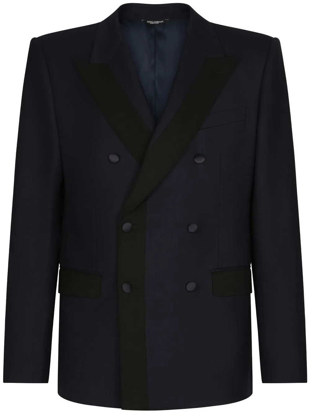 Темно-синий, смесь шерсти и шелка, зазубренные лацканы, двубортная застежка на кнопки, длинные рукава, прорезной карман на груди, два передних кармана с клапанами и прямой подол.