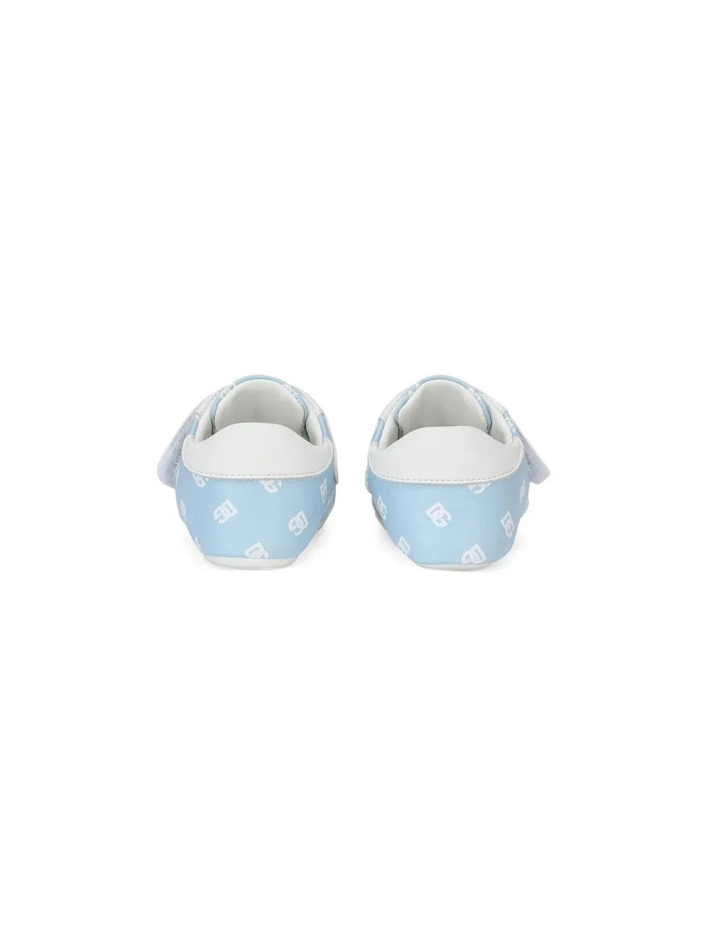 Нежно-голубой, овечья кожа, сплошной принт с логотипом, застежка на липучке спереди, закругленный носок, контрастный задник и плоская резиновая подошва.